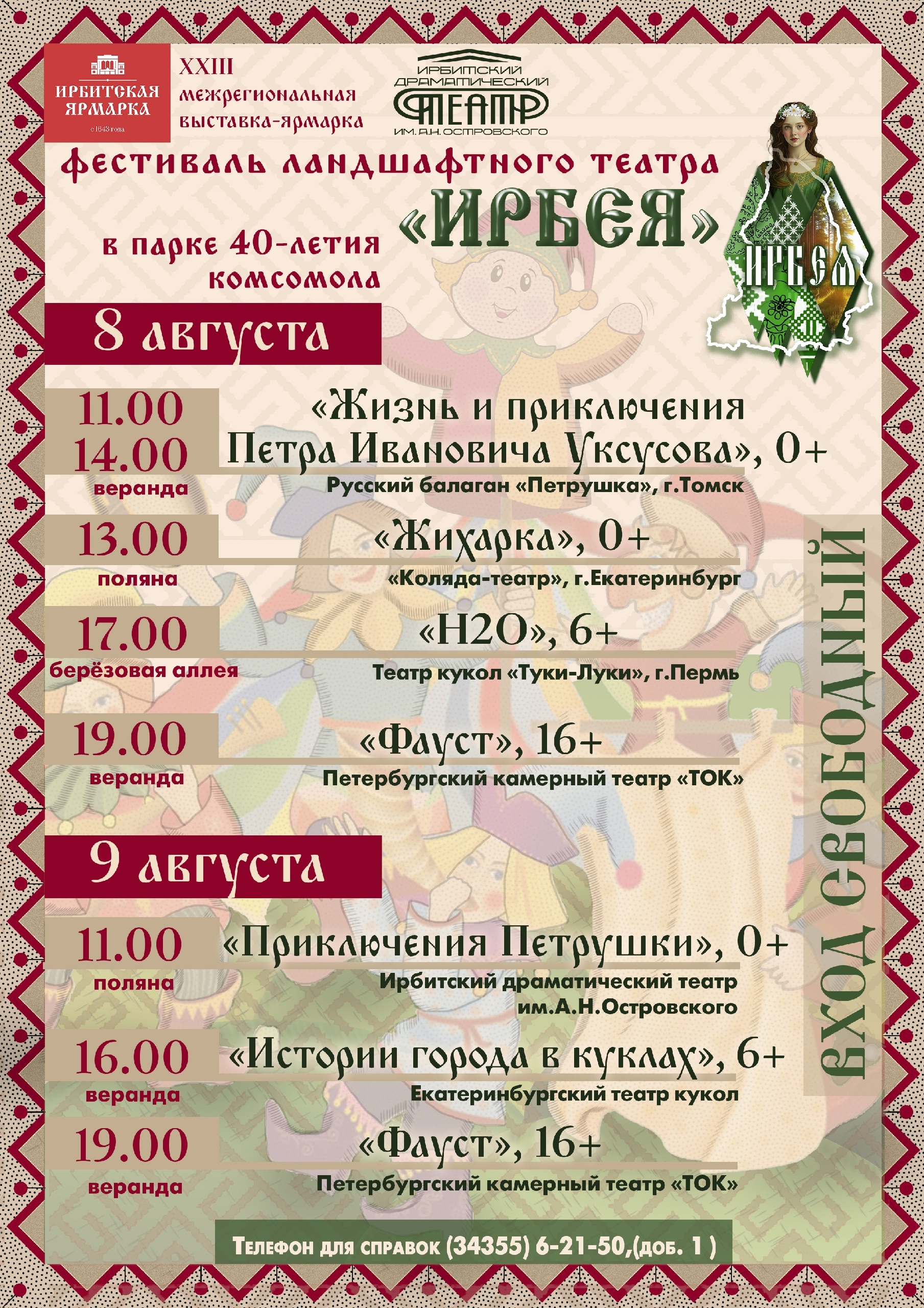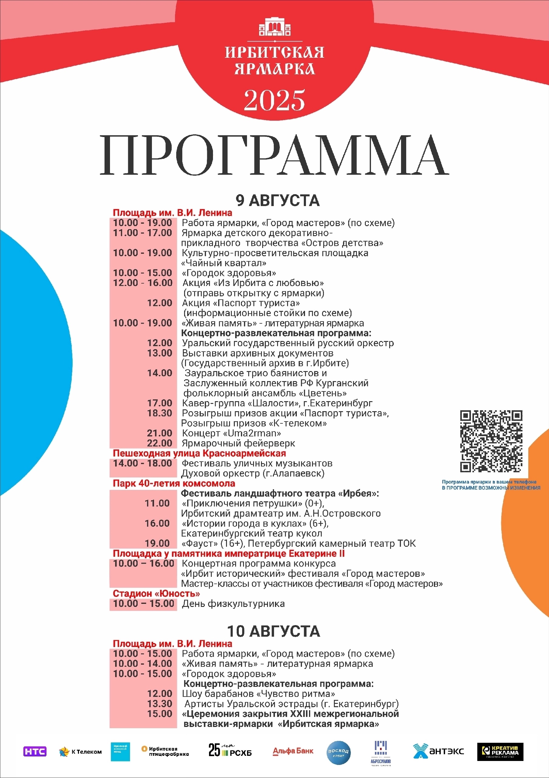 15.00 – 15.30 - Церемония открытия XXIII межрегиональной выставки-ярмарки «Ирбитская ярмарка». Открытие XVII Фестиваля «Город мастеров»
