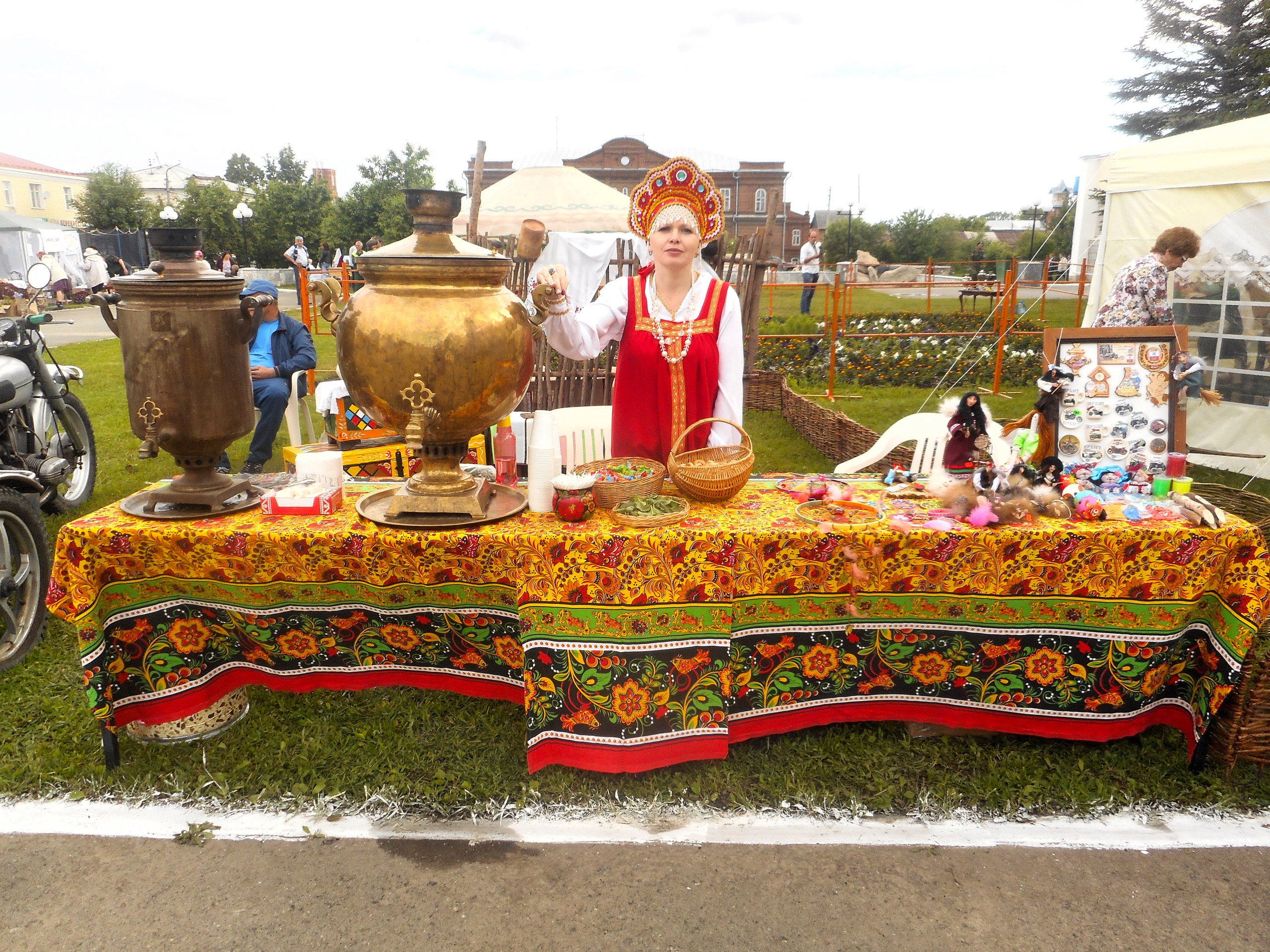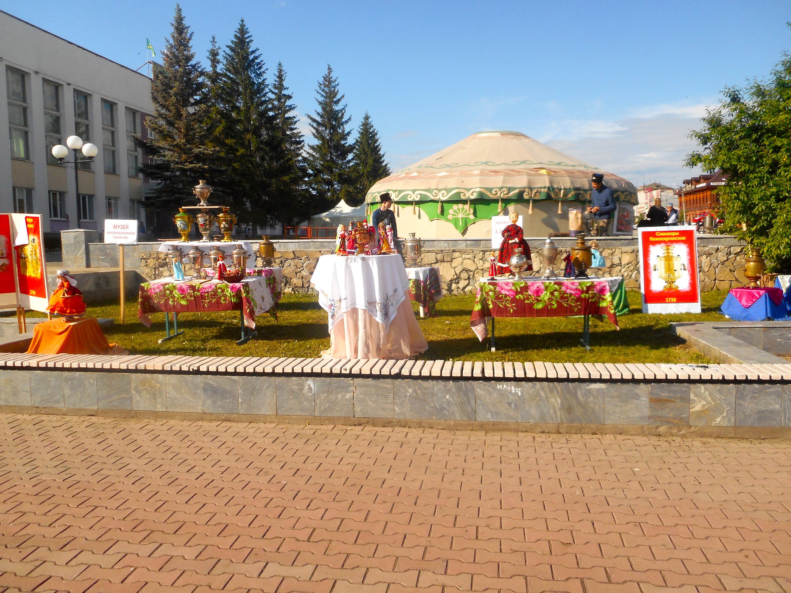 Ирбитский музей народного быта был представлен очень достойно. Как вы помните, в нашем музее только жаровые самовары, их более 320 штук. Мы выехали со своими самыми интересными экспонатами: царь-самовар, два трактирных самовара на 60 и 30 литров, самовар-шар, самовар-груша, самовар-банка, трёх видов, самовар-яйцо, самовар-петух, самовар цыганский.