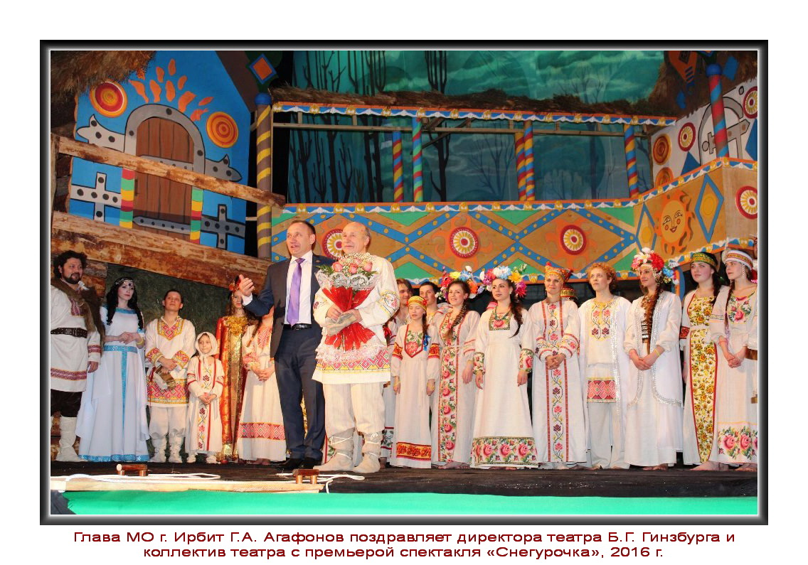 Почетной грамотой главы муниципального образования город Ирбит «За многолетнюю преданность театру и развитие театрального дела на территории муниципального образования город Ирбит» награжден директор театра Гинзбург Борис Григорьевич.