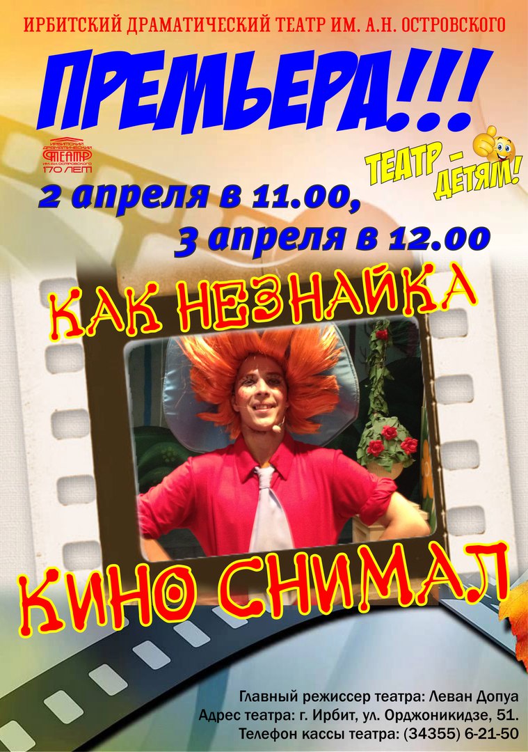 Специально на премьеру приезжали ребята из Туринска, были семьи из Екатеринбурга и других городов. Сказку посмотрели более 100 юных зрителей и родителей. И все они в восторге! Озорной мальчишка и его друзья коротышки рассказали как изобреталось кино и как оно снимается. Юные зрители и сами приняли участие в съемках! Камера у Незнайки настоящая, и на экране зрители видели всё что снимается! Каждую субботу, до сказки с ребятами играют сказочные герои и разыгрывают призовые флаера (флаера а ребята копят весь год, что бы 1 июня выиграть ВЕЛОСИПЕД). А каждое воскресение в фойе театра работает фото зона, где можно сфотографироваться со сказочными персонажами.