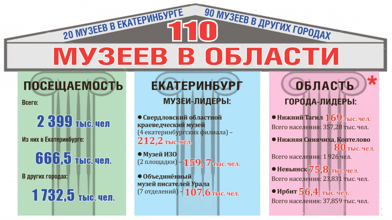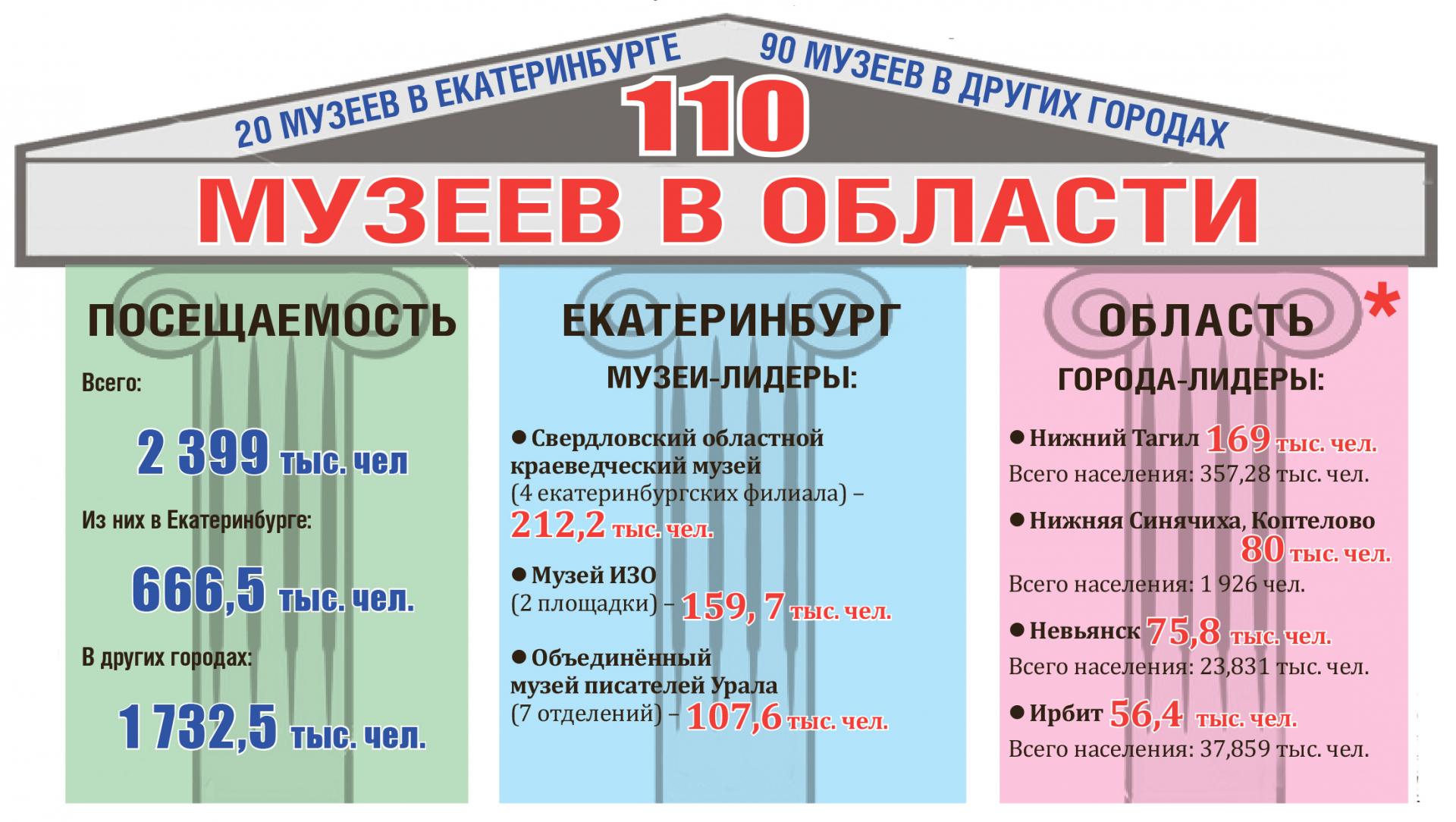 Самое любопытное открытие, которое мы сделали в результате подсчётов – практически во всех областных городах, где есть крупные музеи, число посетителей за год превышает местное население (!). К примеру, в Нижней Синячихе и Коптелово (мы считаем их вместе, так как они очень близко, и обычно экскурсии включают сразу оба населённых пункта) посетителей музеев в сорок раз больше, чем жителей.