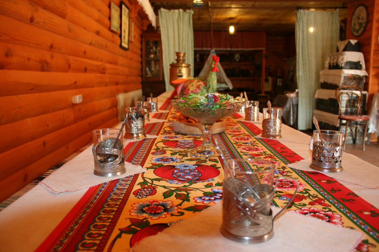 В музее стараются сохранять живые традиции чаепития. Гостей здесь встречают ароматным травяным чаем, подаваемым в стаканах с подстаканниками, а также блинами, которые пекут в настоящей русской печке.
