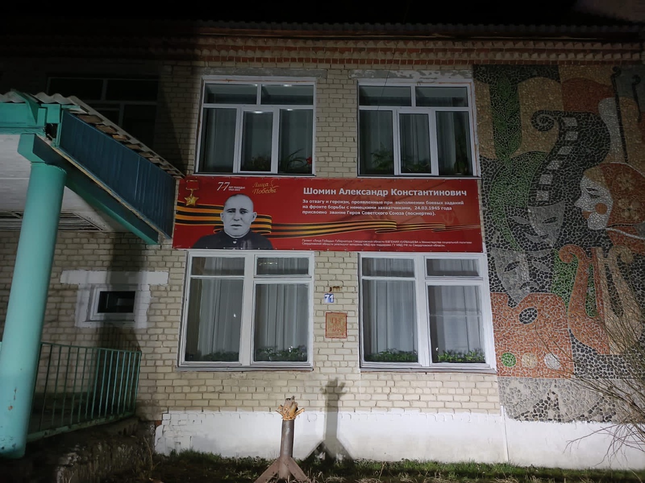 Герой Советского Союза ШОМИН Александр Константинович. Баннер на фасаде Стриганского сельского Дома Культуры.