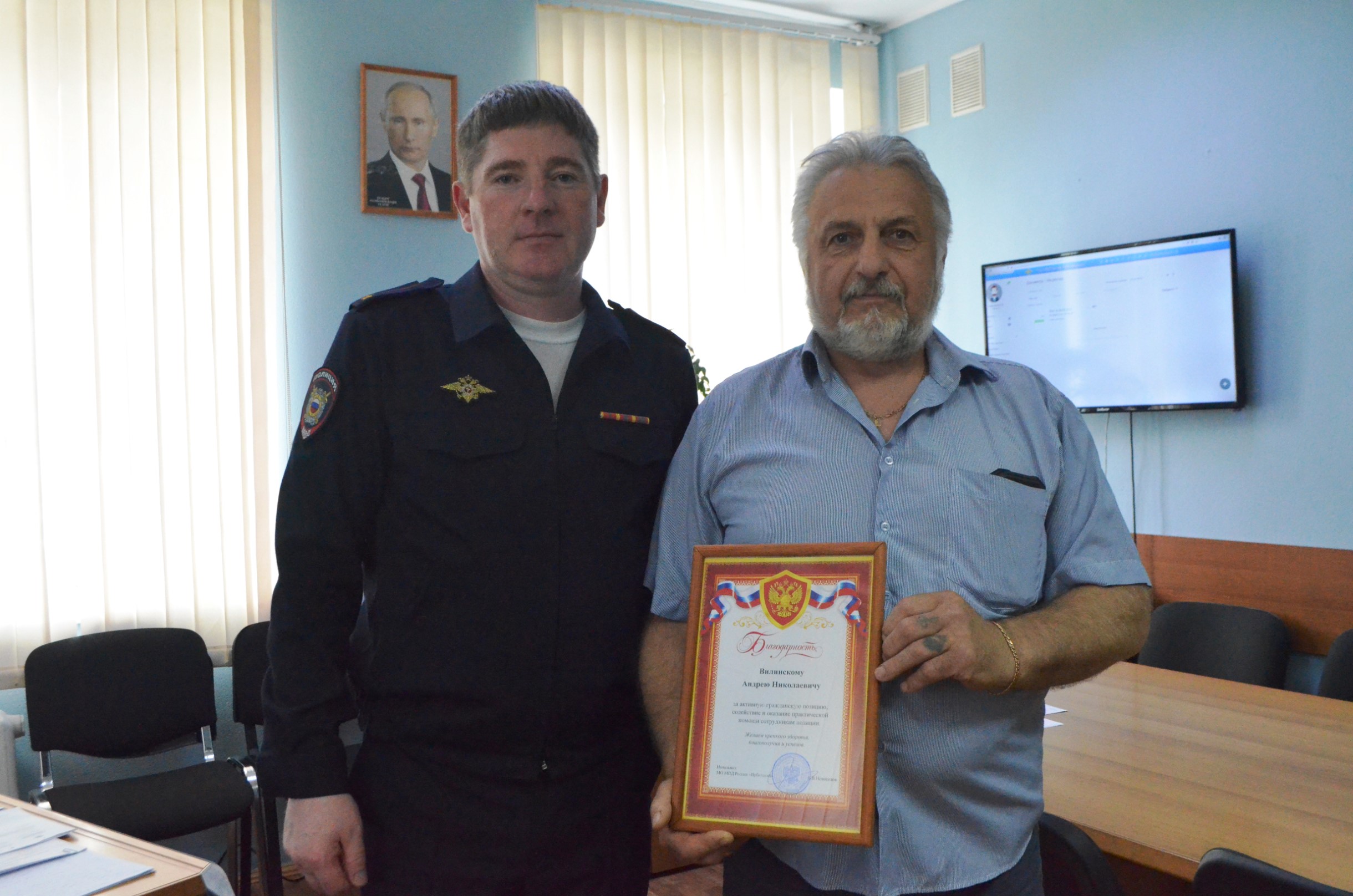 Начальник межмуниципального отдела МВД России «Ирбитский» Евгений Новоселов поблагодарил за содействие и оказание практической помощи сотрудникам полиции неравнодушного местного жителя. Подполковник полиции пожал руку и вручил благодарность ветерану МВД Андрею Николаевичу Вилинскому, который помог полицейским извлечь труп из реки.
