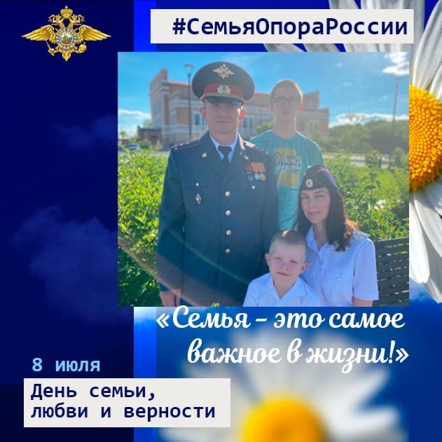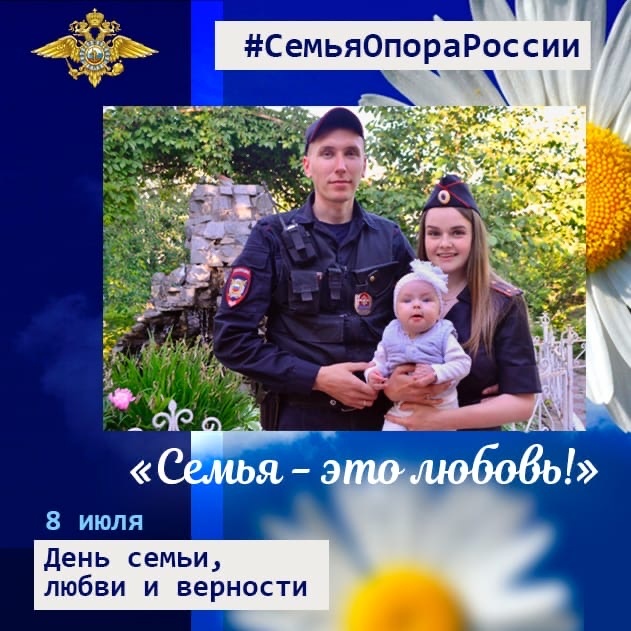 Традиционно, 8 июля, в нашей стране отмечают замечательный праздник День семьи, любви и верности. В этом году праздник стал официальным после утверждения Указом Президента Российской Федерации Владимира Путина. Сотрудники МО МВД России «Ирбитский» в преддверии праздника присоединились к проекту «Семья – опора России», в рамках которого по всей стране публикуются фотографии прекрасных полицейских семей.