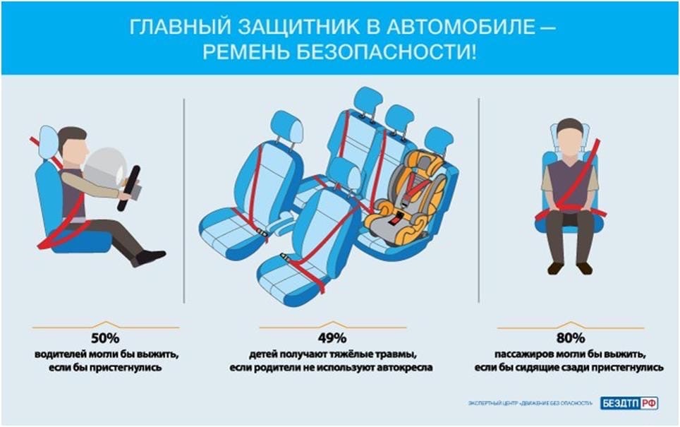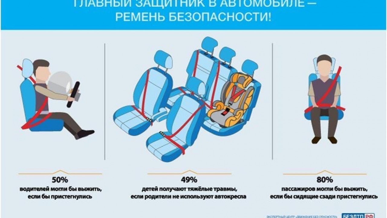 Водителям и пассажирам транспортных средств следует помнить, что ремень фиксирует человека в автомобиле и надежно удерживает его на сиденье. В случае столкновения только благодаря фиксации водитель и пассажиры не перемещаются по салону и не вылетают из автомобиля.