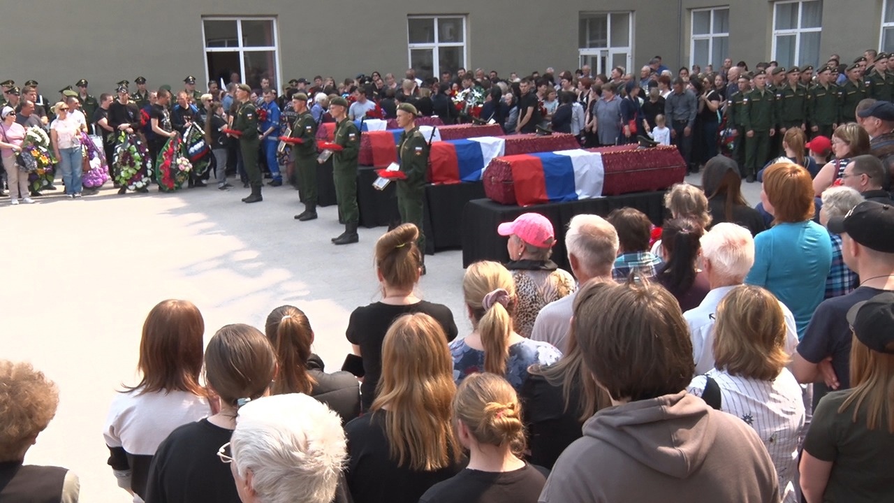 У Дворца культуры прошел траурный митинг, участники которого простились с земляками, погибшими в ходе специальной военной операции. Цветы, венки, слова соболезнования родным и близким, выстрелы оружейного салюта.