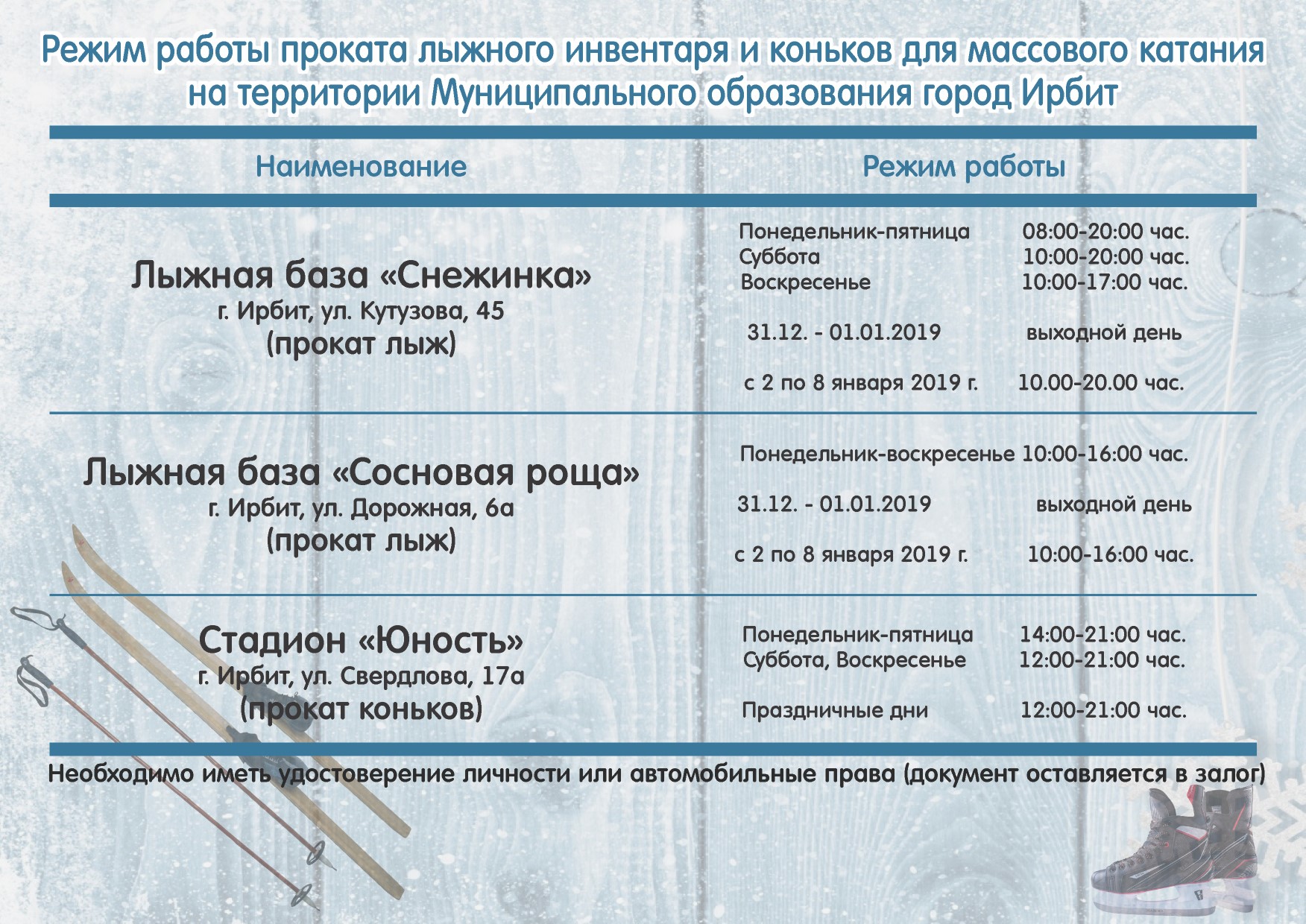 Администратор, 29 декабря, 2018 Image Режим работы проката лыжного инвентаря и коньков для массового катания на территории МО г. Ирбит Организация Лыжная база "Снежинка" Лыжная база "Сосновая роща" Стадион "Юность" Рубрика Общество 727 просмотров