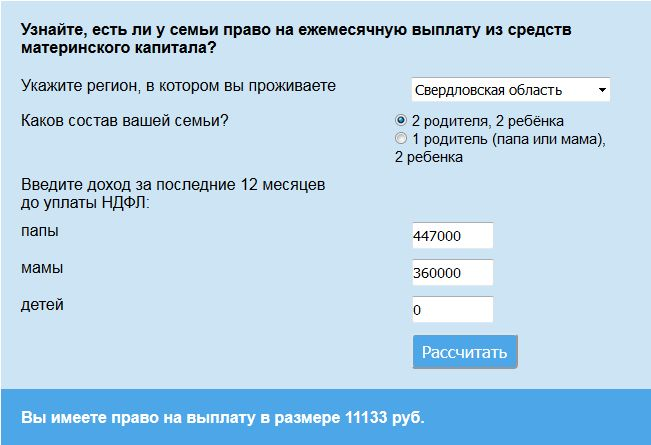 Понять, имеет ли семья право на получение ежемесячной выплаты можно с помощью специального калькулятора на официальном сайте ПФР pfrf.ru в разделе «Гражданам / Получателям МСК / Как получить и потратить материнский (семейный) капитал / Как получить ежемесячную выплату из средств материнского капитала».