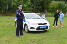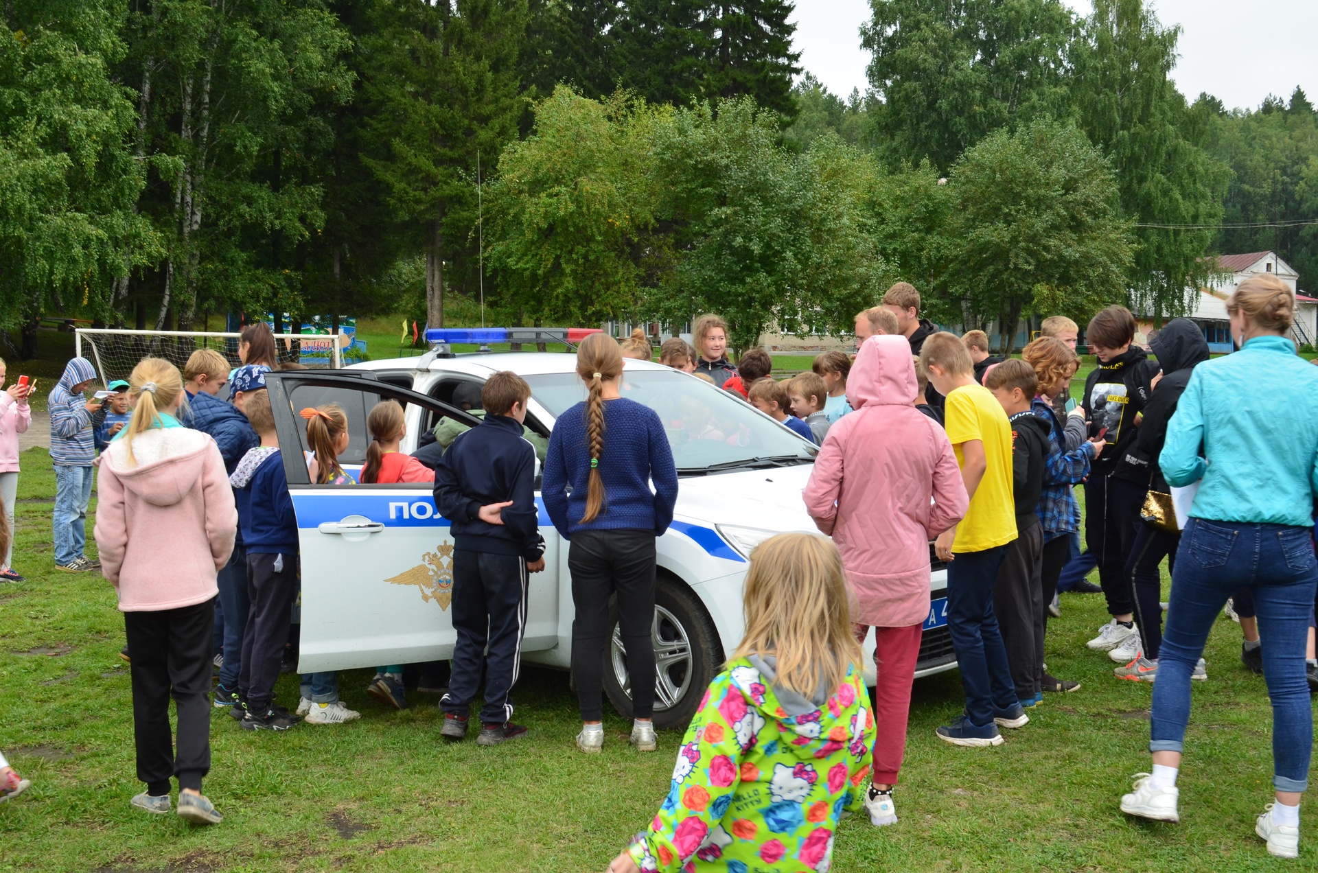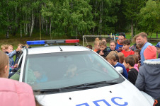 Затем все отряды собрались на трибунах, инспектор ДПС Сергей Гусаров представил детям патрульный автомобиль. Каждый желающий мог примерить на себя роль сотрудника полиции, посидеть в полицейской машине, сказать несколько слов по рации и включить звуковой сигнал на автомобиле.
