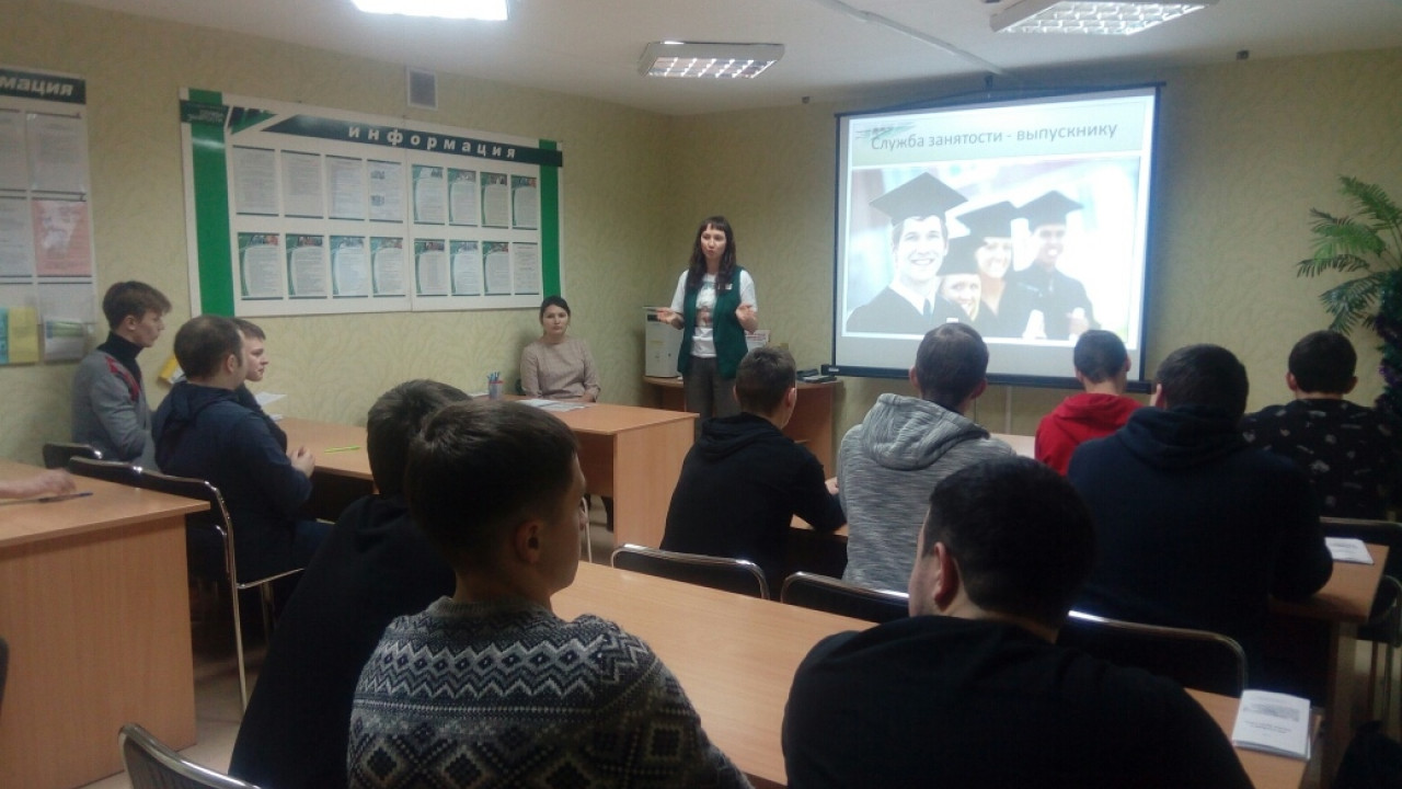 Кристина Михайловна проинформировала студентов, как заняться поиском работы и с чего начать, какие документы необходимы для постановки на учет в центр занятости и какие государственные услуги они могут получить в электронном виде. Также она рас-сказала о программах и услугах центра занятости, которыми ребята могут воспользоваться после окончания обучения, а именно: