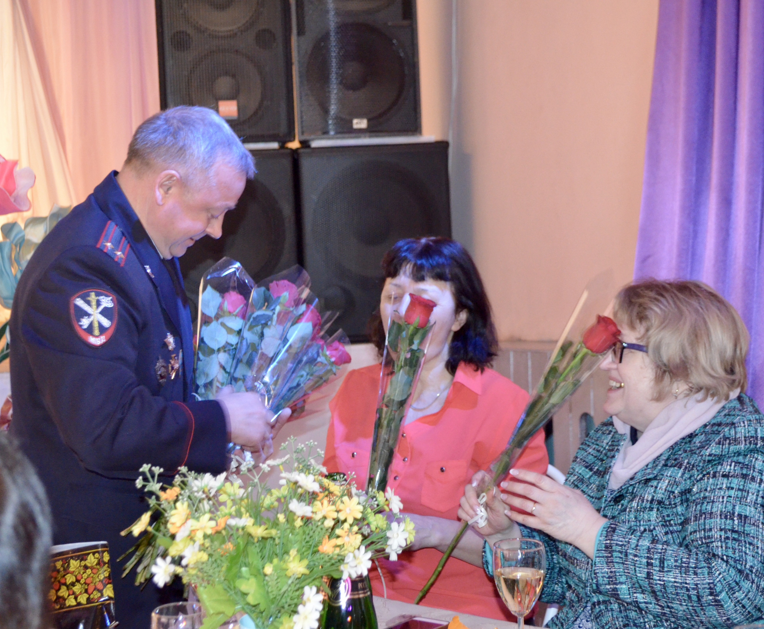 Не обошлось в главный женский и весенний праздник и без цветов. Всем присутствующим женщинам, служащим в полиции, были подарены розы.
