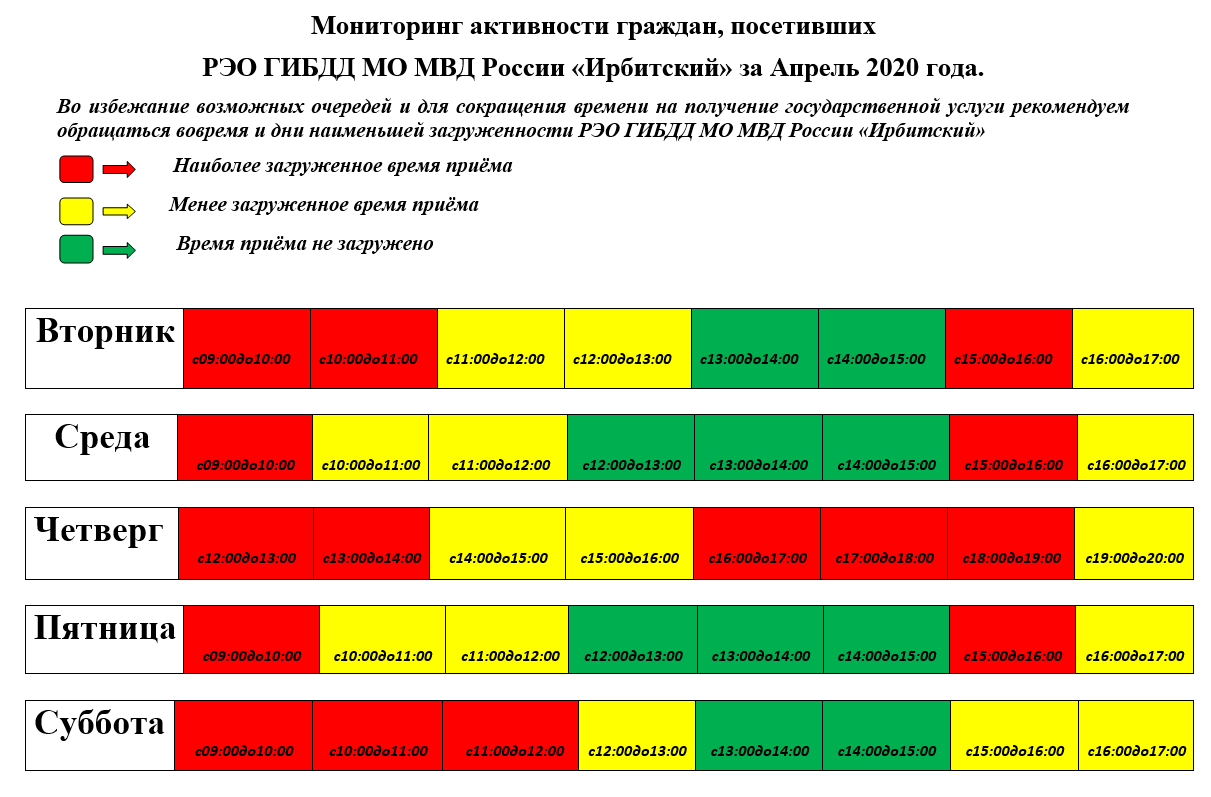 Госавтоинспекция сообщает, что в целях удобства и экономии Вашего времени, исключения очередей при оказании государственных услуг по вопросам регистрации автомототранспортных средств и прицепов к ним, выдачи водительских удостоверений, просит Вас предварительно подавать заявку через Единый портал государственных и муниципальных услуг на получение соответствующей государственной услуги (получение водительского удостоверения, регистрация автомототранспортных средств и прицепов к ним). Еще одним важным преимуществом использования единого портала государственных услуг является предоставление 30% скидки на оплату госпошлины гражданам, подающим заявления на получение государственных услуг в электронном виде. Также сотрудниками РЭО ГИБДД МО МВД России «Ирбитский» ежемесячно проводится мониторинг активности граждан по времени и дням недели, с целью выбора наименее загруженного времени и дня недели для получения госуслуги.