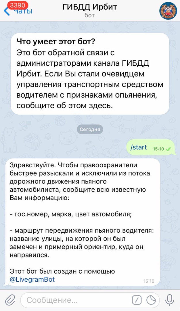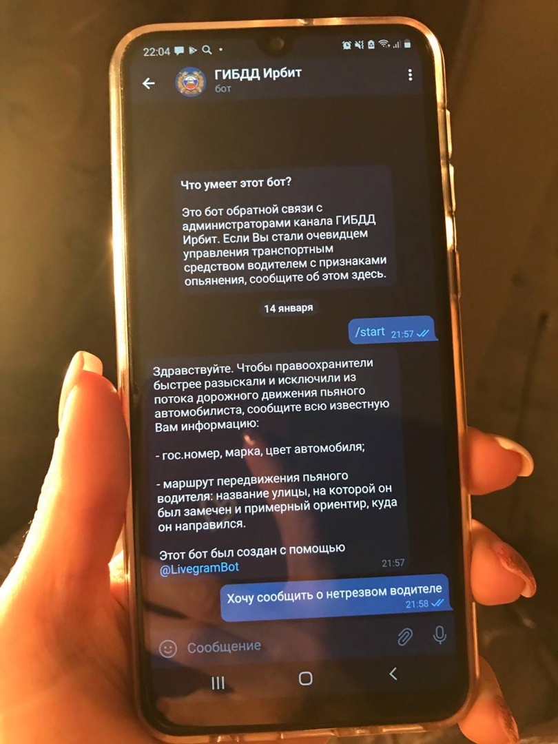 Проявить гражданскую позицию и оказать помощь сотрудникам ГИБДД по исключению из участия в дорожном движении нетрезвых водителей можно, сообщив в дежурную часть МО МВД России "Ирбитский" по телефону 8(34355) 6-25-27. Пользователи мессенджера "Телеграм" также могут сообщить о правонарушении, оставив анонимное сообщение в специальном боте "ГИБДД Ирбит". Все сообщения, поступившие через бот @GIBDD_Irbit_bot, будут оперативно проверены, а нарушители задержаны и привлечены к ответственности.