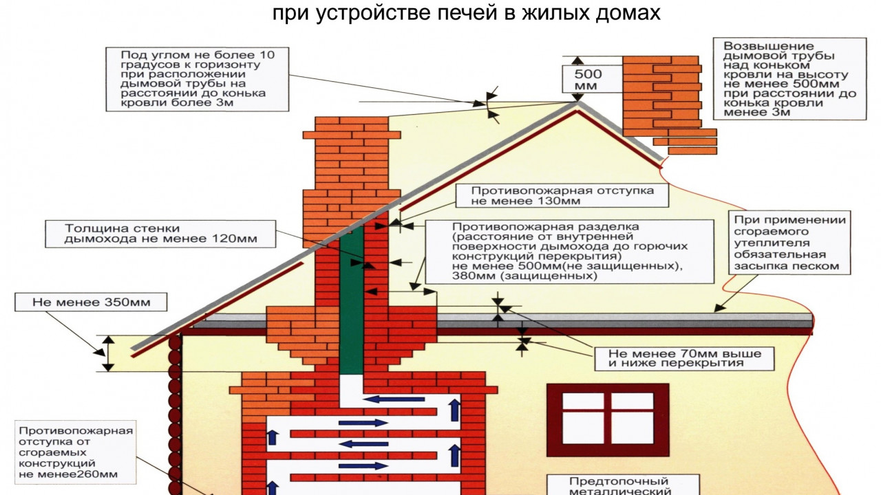 - печь, дымовая труба в местах соединения с деревянными чердачными или межэтажными перекрытиями должны иметь утолщения кирпичной кладки - разделку. Не нужно забывать и про утолщение стенок печи. Любая печь должна иметь самостоятельный фундамент и не примыкать всей плоскостью одной из стенок к деревянным конструкциям. Нужно оставлять между ними воздушный промежуток (отступку);