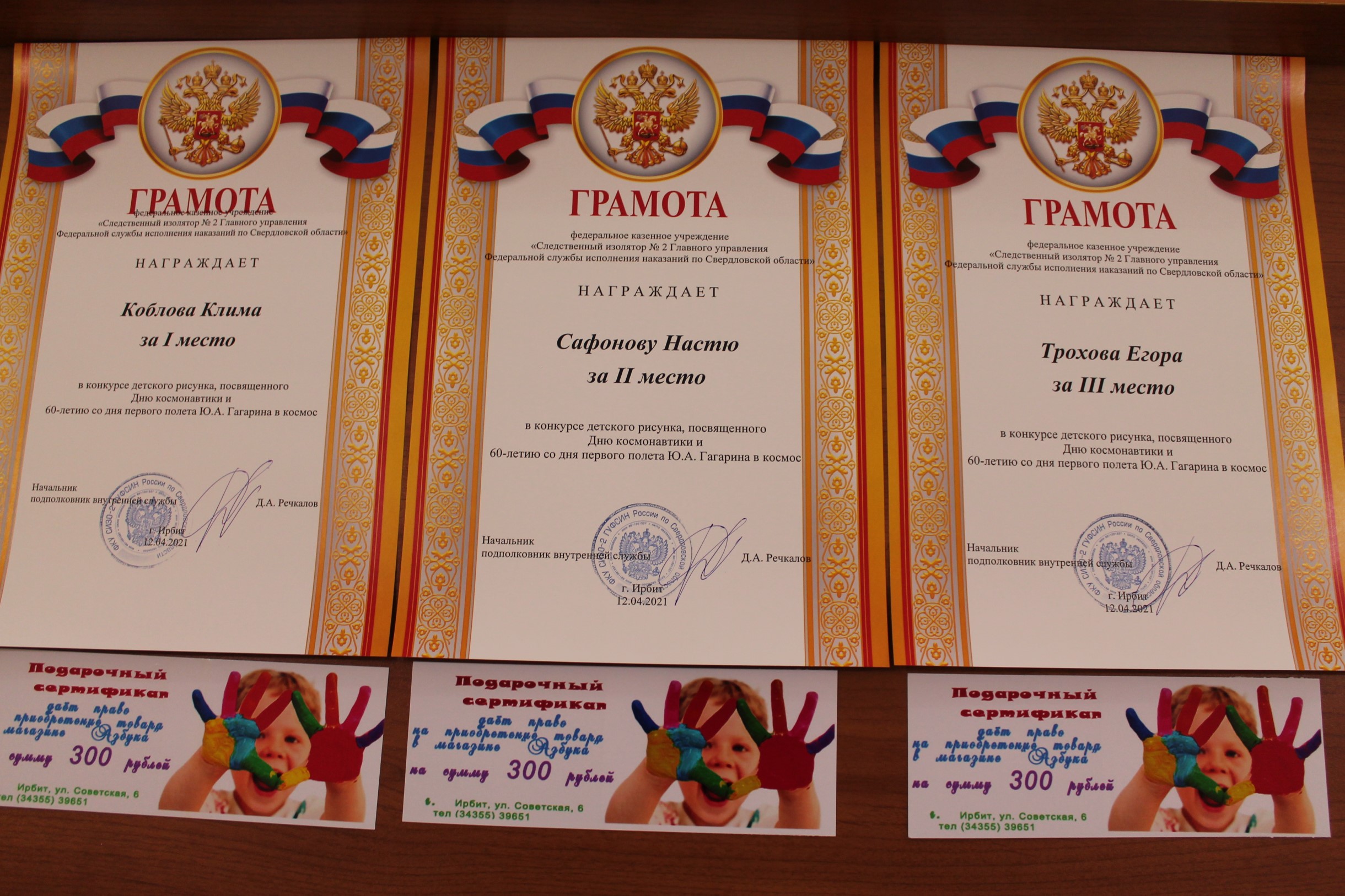 09.04.2021 г. в СИЗО-2 (г. Ирбит) состоялось подведение итогов конкурса детского рисунка, посвященного Дню космонавтики и 60-летию со дня полета Юрия Гагарина в космос. На рассмотрение жюри было предоставлено 7 красочных работ, выполненных детьми сотрудниками учреждения. В итоге призовые места распределились следующим образом: