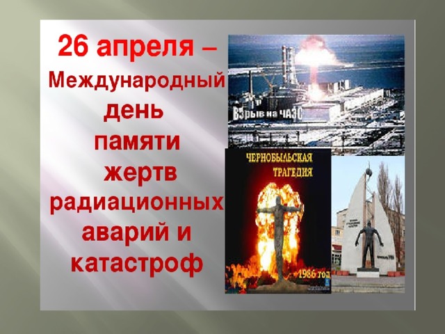 День 26 апреля решением Совета глав государств СНГ объявлен Международным днем памяти жертв радиационных аварий и катастроф. Вечная память всем тем, кто отдал жизни для того, чтобы ликвидировать последствия, самой серьёзной в истории человечества чрезвычайной ситуации. Чернобыльская катастрофа никогда не забудется, эта великая по своим масштабам и последствиям техногенная катастрофа, которая навечно останется в памяти и будет служить предостережением людям, живущим сегодня и их потомкам.