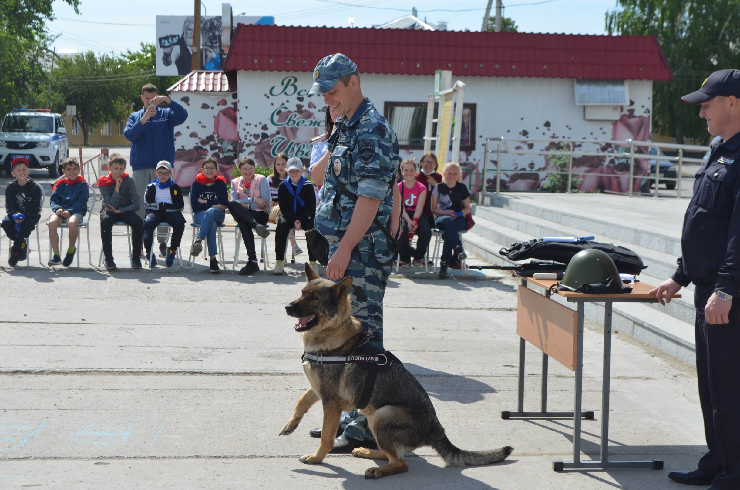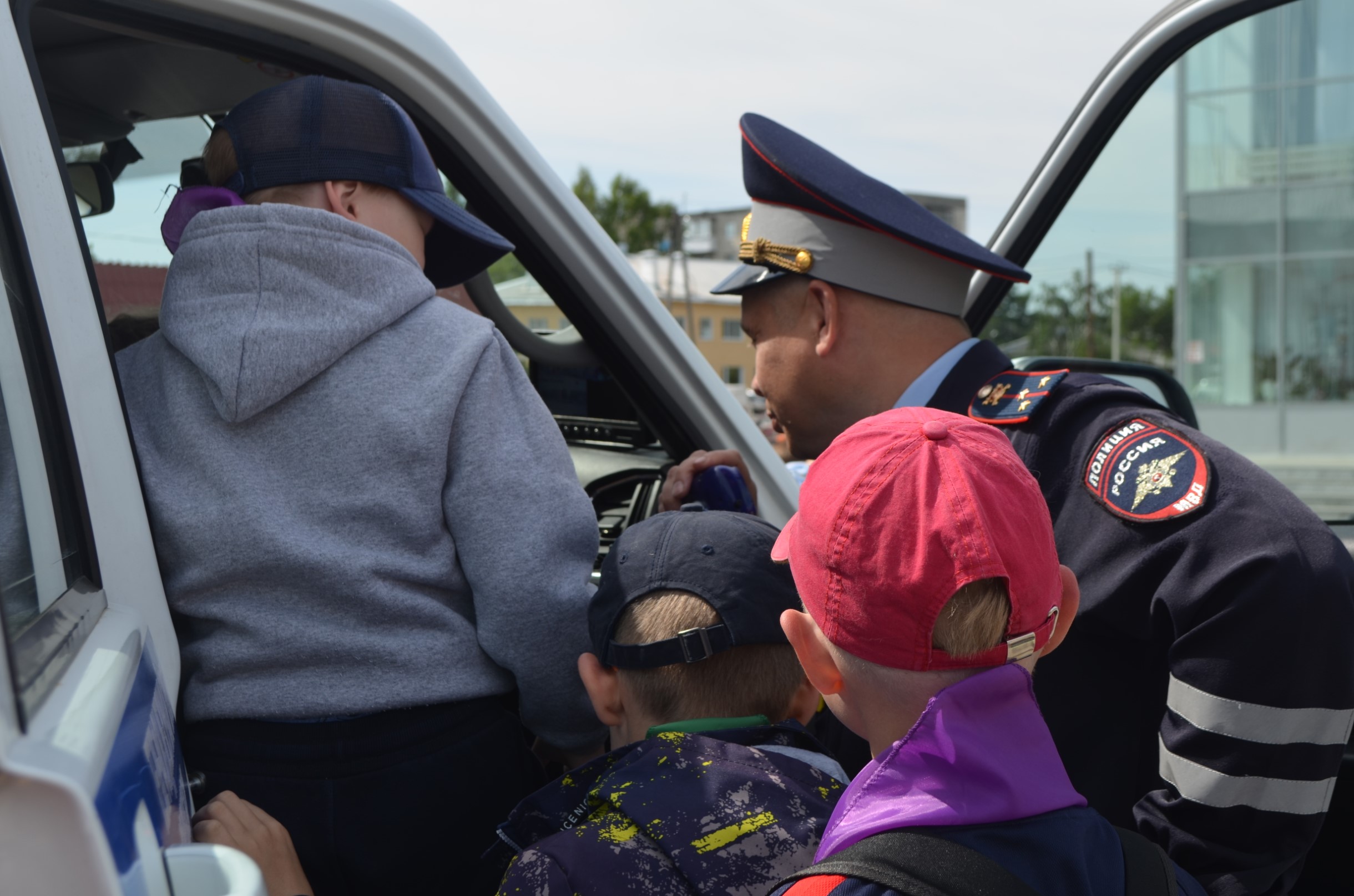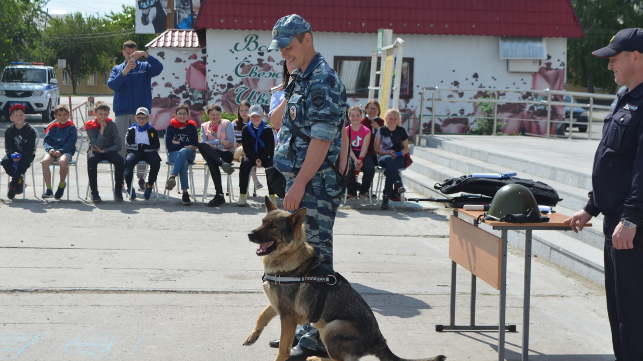 Ребятам с площадки очень интересно было побольше узнать о работе полиции. С профессией кинолога их познакомил старший инспектор-кинолог МО МВД России «Ирбитский» Сергей Фролов. Он продемонстрировал умения своей служебной собаки Черри, показал, как она находит взрывчатые вещества в машине и ловит преступников. Старший инспектор группы ООП Роман Клещев и юрисконсульт Екатерина Анисимова показали ребята рабочий инвентарь полицейских: бронежилет, каску, пистолет, металлоискатель, наручники. Детям дали возможность всё внимательно рассмотреть, примерить и почувствовать себя настоящими полицейскими. С профессией инспектора ДПС ребят познакомил старший лейтенант полиции Максим Большедворов. Он рассказал о своей работе и показал детям патрульный автомобиль. Больше всего в машине инспектора ребят привлекли сирена и рация.