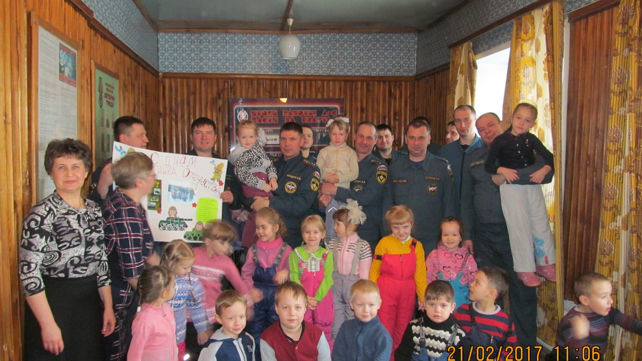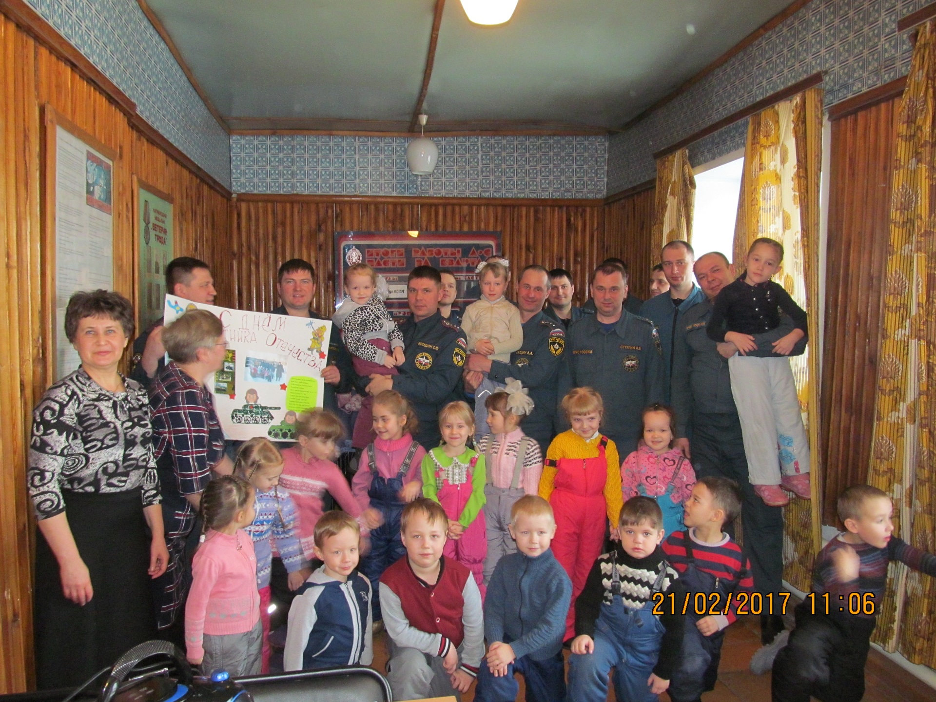 В день празднования «Дня защитника Отечества» в пожарно-спасательную часть № 60 города Ирбита прибыли воспитанники детского сада № 1. Ребята пришли не как обычно на экскурсию, а подготовили целый концерт, они пели песни, рассказывали стихи и загадывали загадки. Дошколята старались и волновались, рассказывая про доблестных защитников отечества. Самым запоминающимся выступлением был стих про любимого папу, который задел своими словами каждого пожарного до глубины души. Воспитателями детского сада было сказано много хороших и теплых слов поздравлений в адрес сотрудников пожарной части.