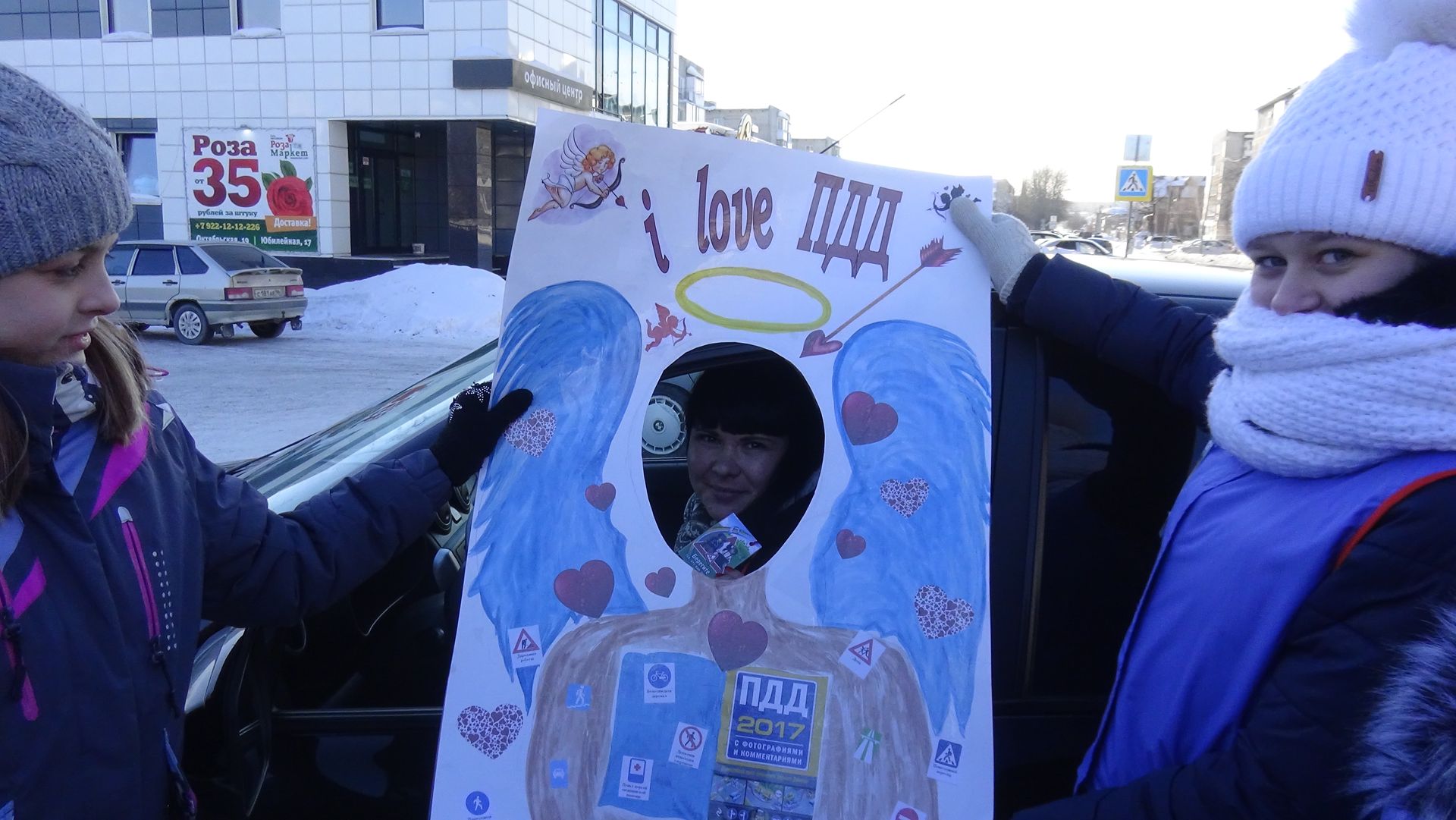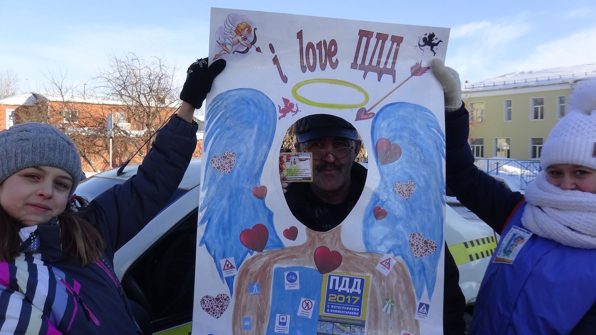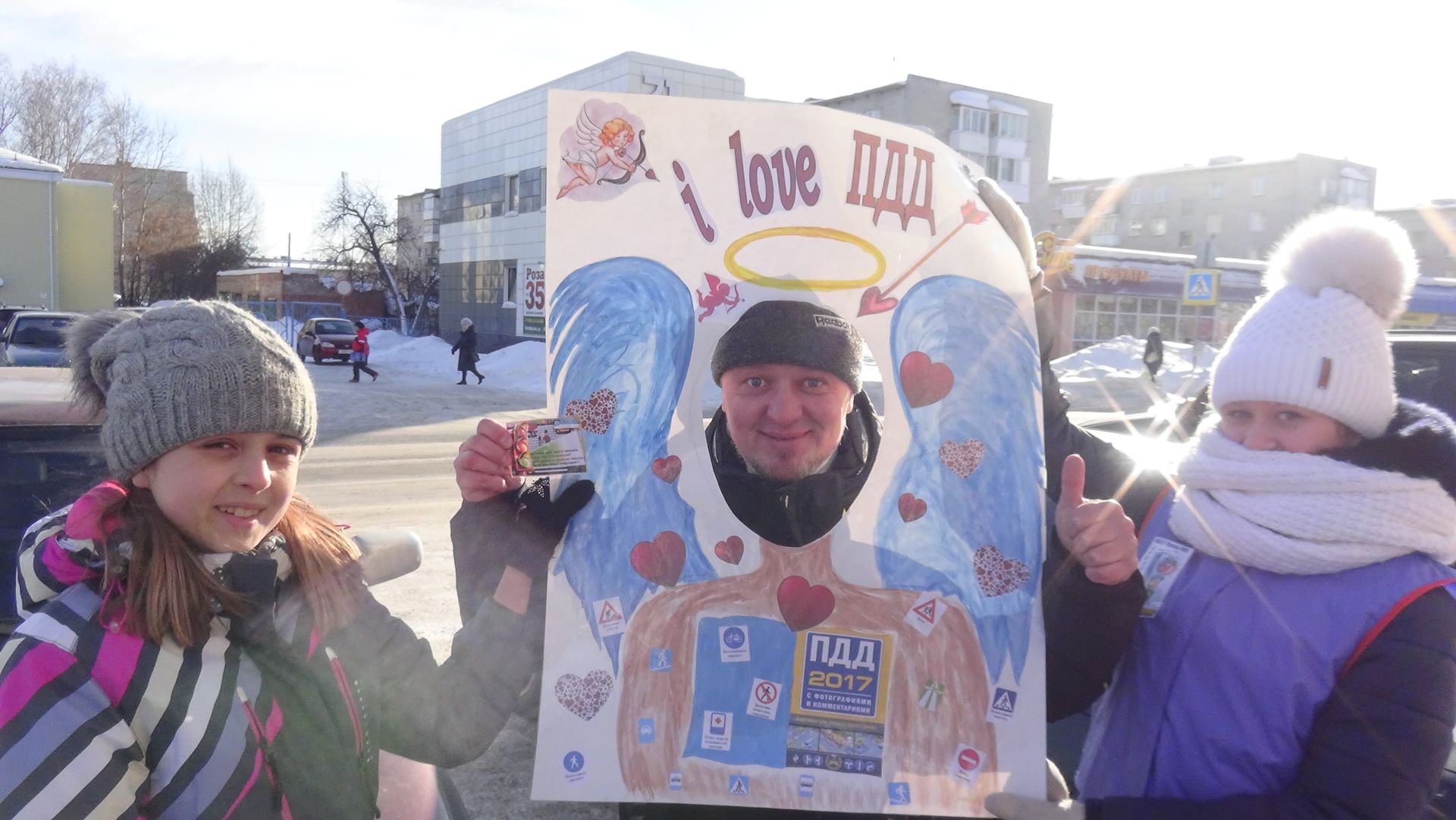 В качестве подарка участники акции с улыбками и в приподнятом настроении получали памятки, воздушные шары и фотографировались в специально изготовленной рамке «Я люблю ПДД».