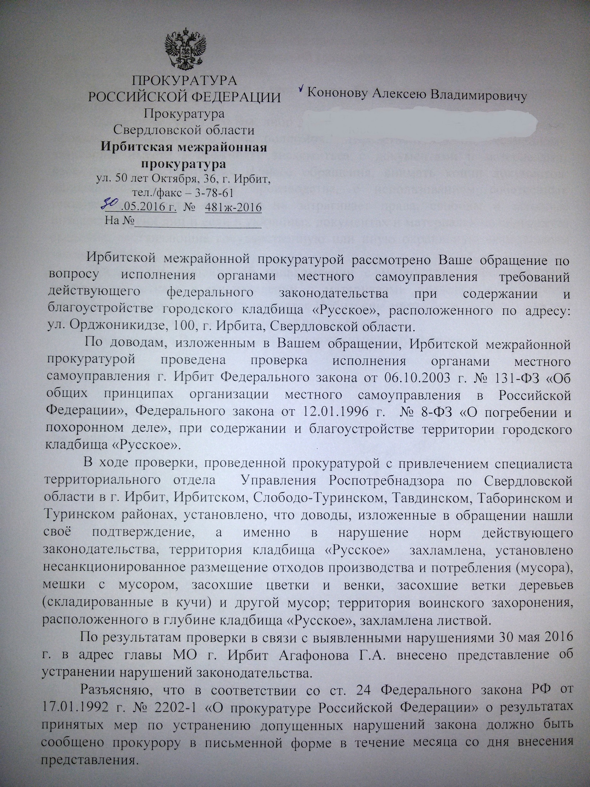 Территория кладбища захламлена, установлено несанкционированное размещение отходов производства и потребления (мусора), мешки с мусором, засохшие цветки и венки, засохшие ветки деревьев (складированные в кучу) и другой мусор; территория воинского захоронения, расположенного в глубине кладбища "Русское", захламлена листвой. По результатам проверки в связи с выявленными нарушениями 30 мая 2016 года в адрес Главы МО г. Ирбит Г.А. Агафонова вынесено представление об устранении нарушений законодательства.