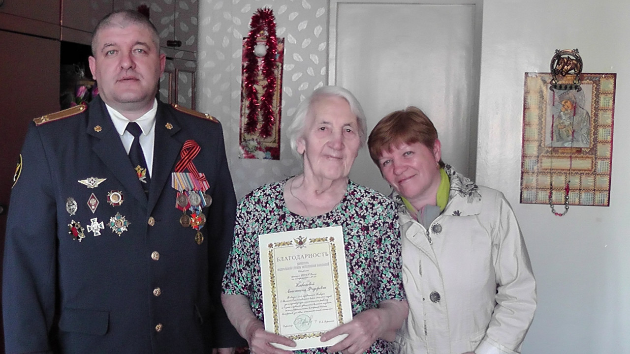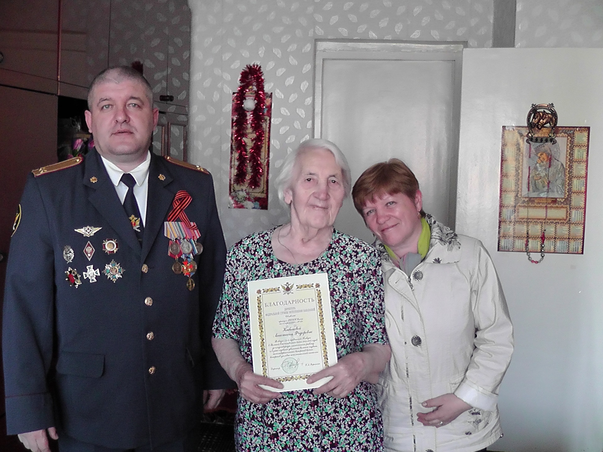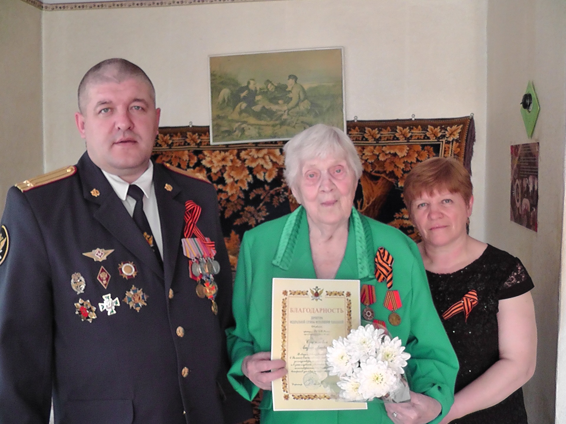 9 мая начальник СИЗО-2 (г. Ирбит) ГУФСИН России по Свердловской области Игорь Крошняков совместно с председателем совета ветеранов Людмилой Балакиной и заместителем начальника по кадрам и воспитательной работе Кадочниковым Романом посетили по месту жительства тружеников тыла Великой Отечественной войны Анастасию Спиридоновну Боровикову, Анастасию Федоровну Кабанову и Лидию Андреевну Стожкову. Всем ветеранам вручили благодарности директора ФСИН России, поздравления начальника управления Свердловской области и букеты цветов.