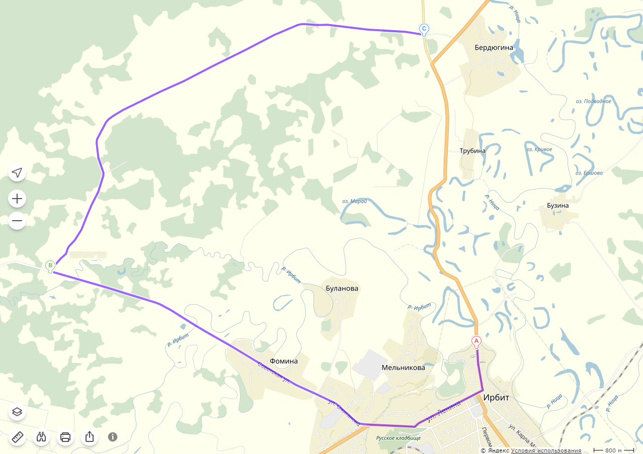 Поворот на деревню Бобровка (Петрушата) со стороны Ирбита обозначен буквой B.