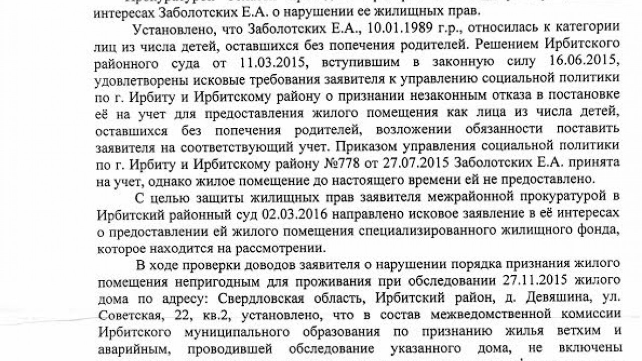 Речь идет не про отсутствие непрофессионализма, а про самое настоящее наплевательское отношение к людям. Деятельность ирбитской межведомственной комиссии по признанию жилья ветхим и аварийным признана незаконной. Согласно ответу прокуратуры в состав комиссии при обследовании дома представители администрации не удосужились включить специалистов пожарной, промышленной, экологической, санитарно-эпидемиологических надзорных органов.
