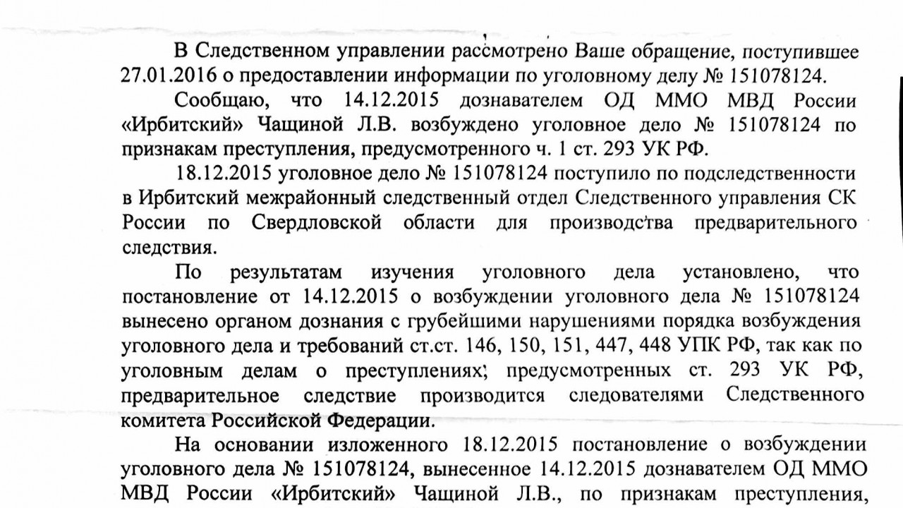 По словам депутата Законодательного собрания Игоря Торощина, изначально уголовное дело по ст. 293 УК РФ было возбуждено сотрудниками МВД «Ирбитский» и было отправлено на предварительное следствие, но Следственным комитетом РФ были выявлены грубейшие нарушения, что и послужило приостановкой дела.