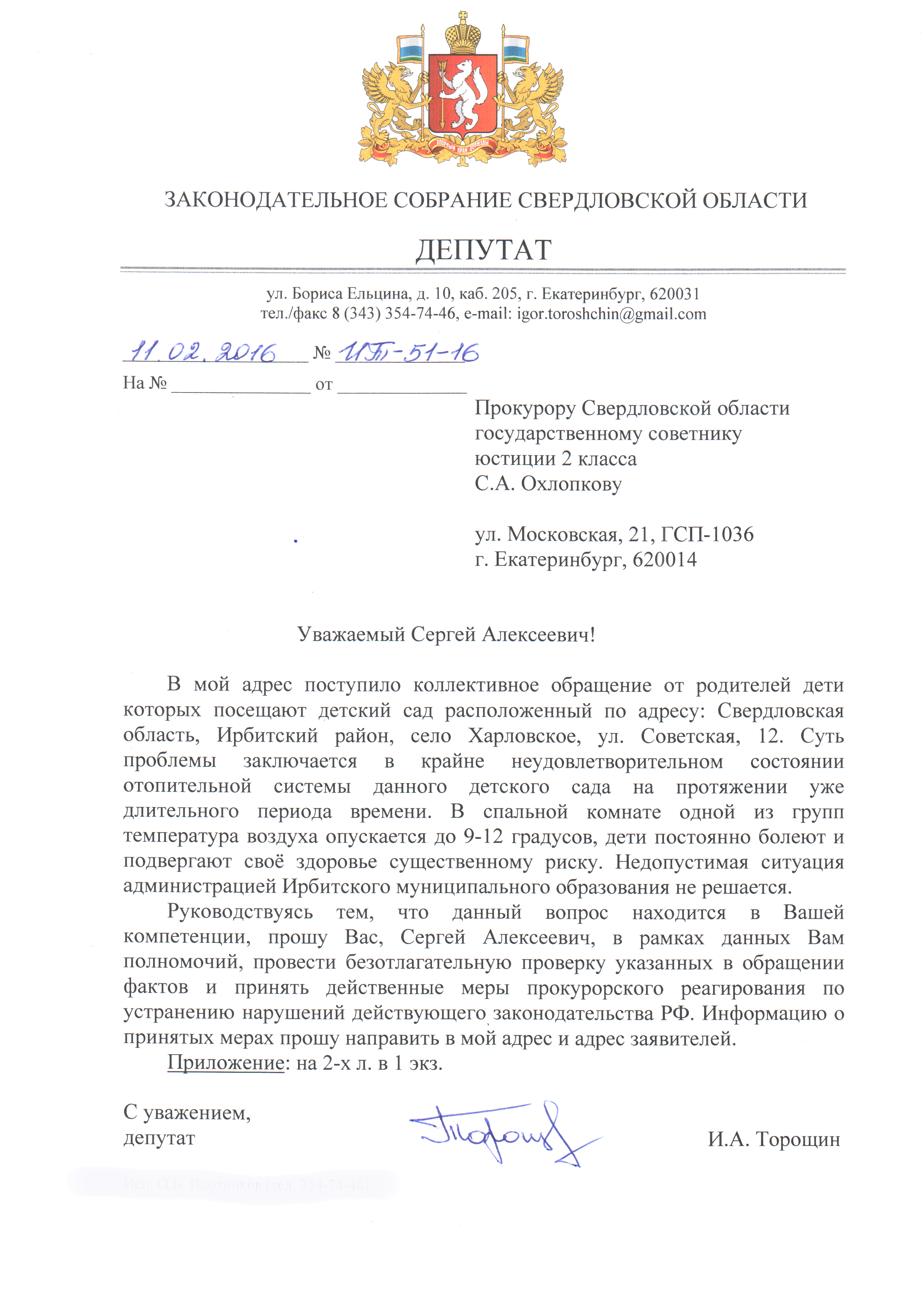По словам депутата Законодательного Собрания Свердловской области Игоря Торощина, в его адрес обратились жители села Харловское и деревни Сосновка. В своем обращении жители указывают на тот факт, что в дошкольном учреждении, куда они вынуждены водить своих детей, на протяжении нескольких лет не соблюдаются температурные нормы. Так, например, зимой столбик термометра в МКДОУ «Харловский детский сад» редко поднимается выше +14 градусов. В основном он находится на отметки +12, а в сильные морозы вообще колеблется на уровне +9. В результате чего, дети часто болеют.