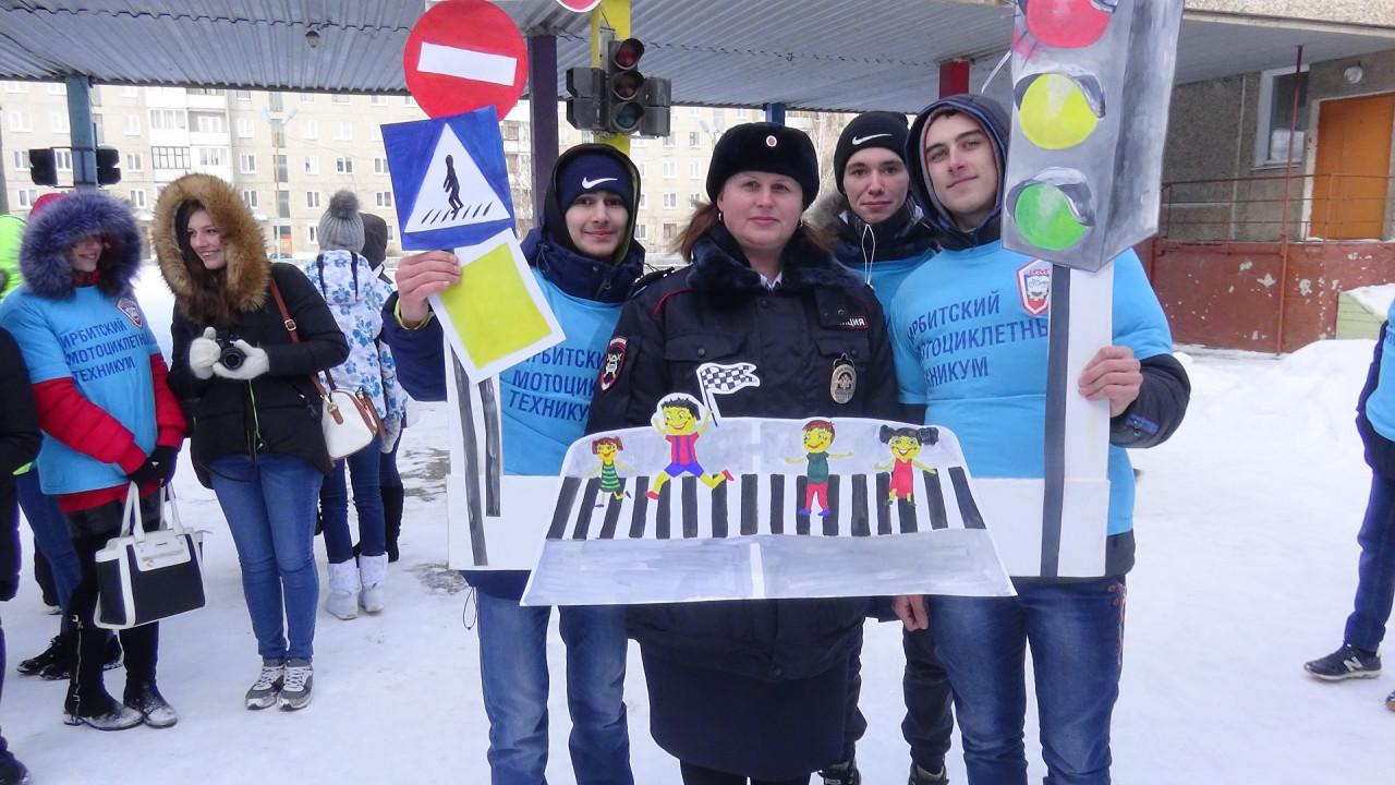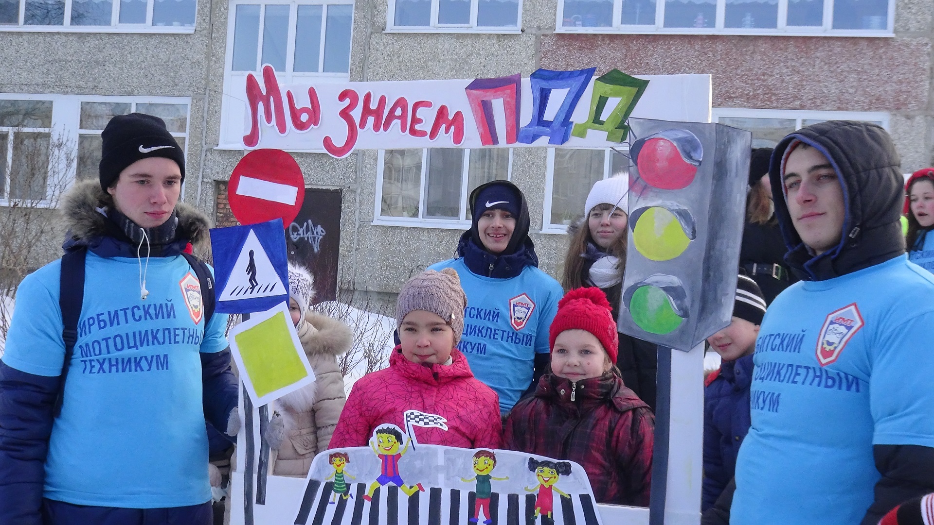 Благополучный жизненный путь от самого рождения неотъемлемо связан с безопасностью на дорогах. Сделать процесс обучения детей Правилам дорожного движения более красочным и интересным решили полицейские и студенты Ирбитского мотоциклетного техникума. В этот раз это было не просто обычное занятие по изучению Правил дорожного движения в стенах класса, а занятие на свежем воздухе на территории школы. Студенты изготовили красочную рамку для «селфи» с дорожными знаками, пешеходным переходом и большой надписью: «Мы знаем ПДД!!!». Инспектор по пропаганде БДД ст.лейтенант полиции Татьяна Бердюгина вместе с студентами задавала каверзные вопросы по ПДД, например, «Сразу можно переходить проезжую часть дороги, если загорелся зеленый сигнал светофора?». Кто-то громко кричал «ДА!», тогда инспектор объясняла ребятам «Есть водители «Двоечники», которые нарушают ПДД, поэтому даже если загорелся зеленый сигнал светофора, необходимо сначала убедиться, что все машины остановились и пропускают пешехода». Ребята с задором отвечали на вопросы, рассказывали истории, которые приключались с ними на дороге, и с улыбками делали «Селфи» в рамке по ПДД.