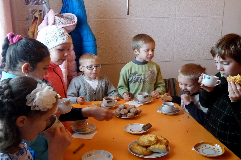 Аппетитные шаньги, сладости ожидали детей за чаепитием. Батюшка с любовью поздравил школьников с окончанием каникул. Он выразил надежду, что все будут усердно трудиться и подарил детям закладки.