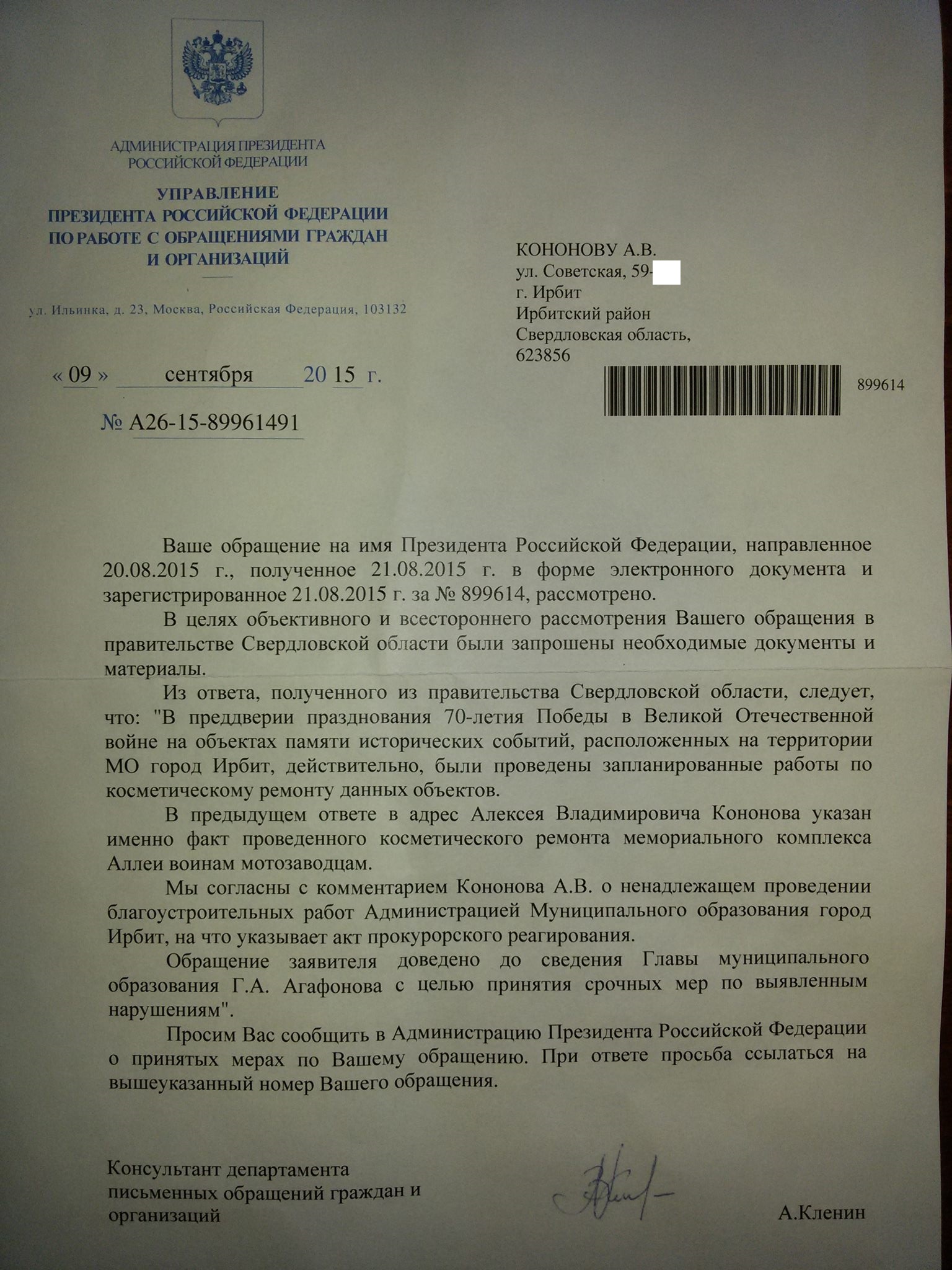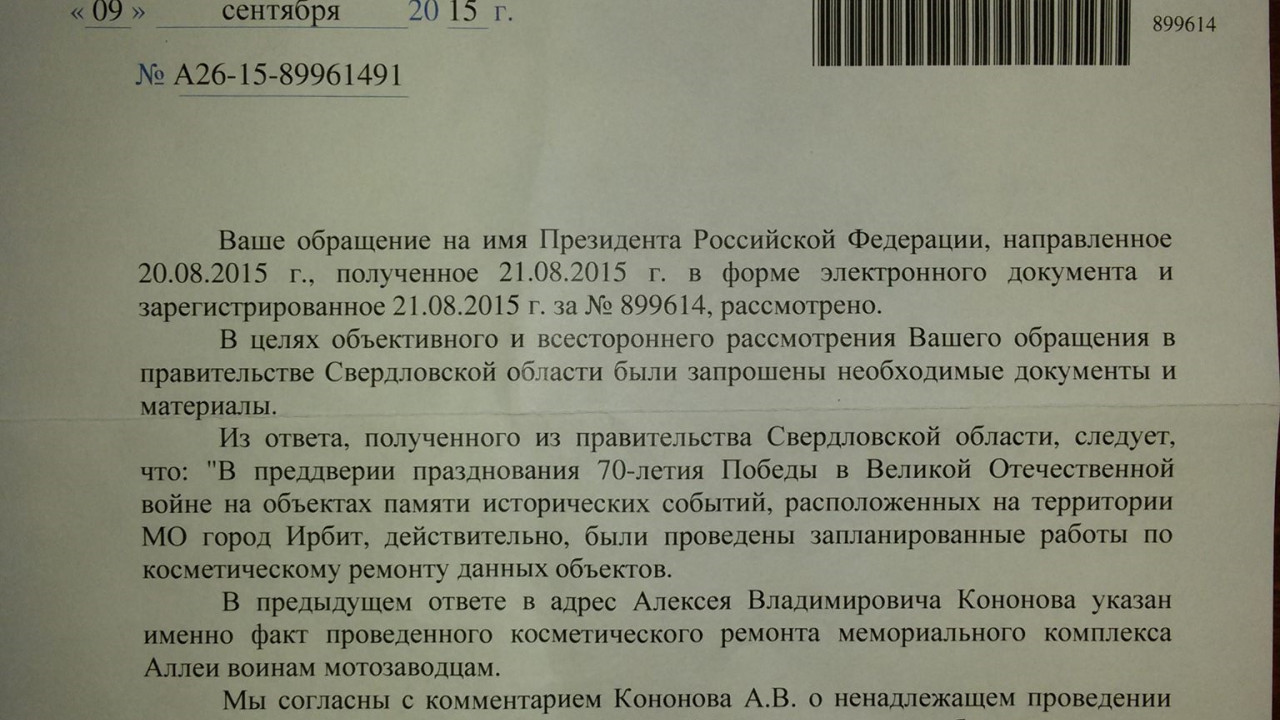 Администрация Президента РФ заинтересовалась вопросом ремонта ирбитских памятников, посвященных Великой Отечественной войне. Активист Алексей Кононов получил письмо из Москвы с оценкой проведения работ на аллее воинам-мотозаводцам.