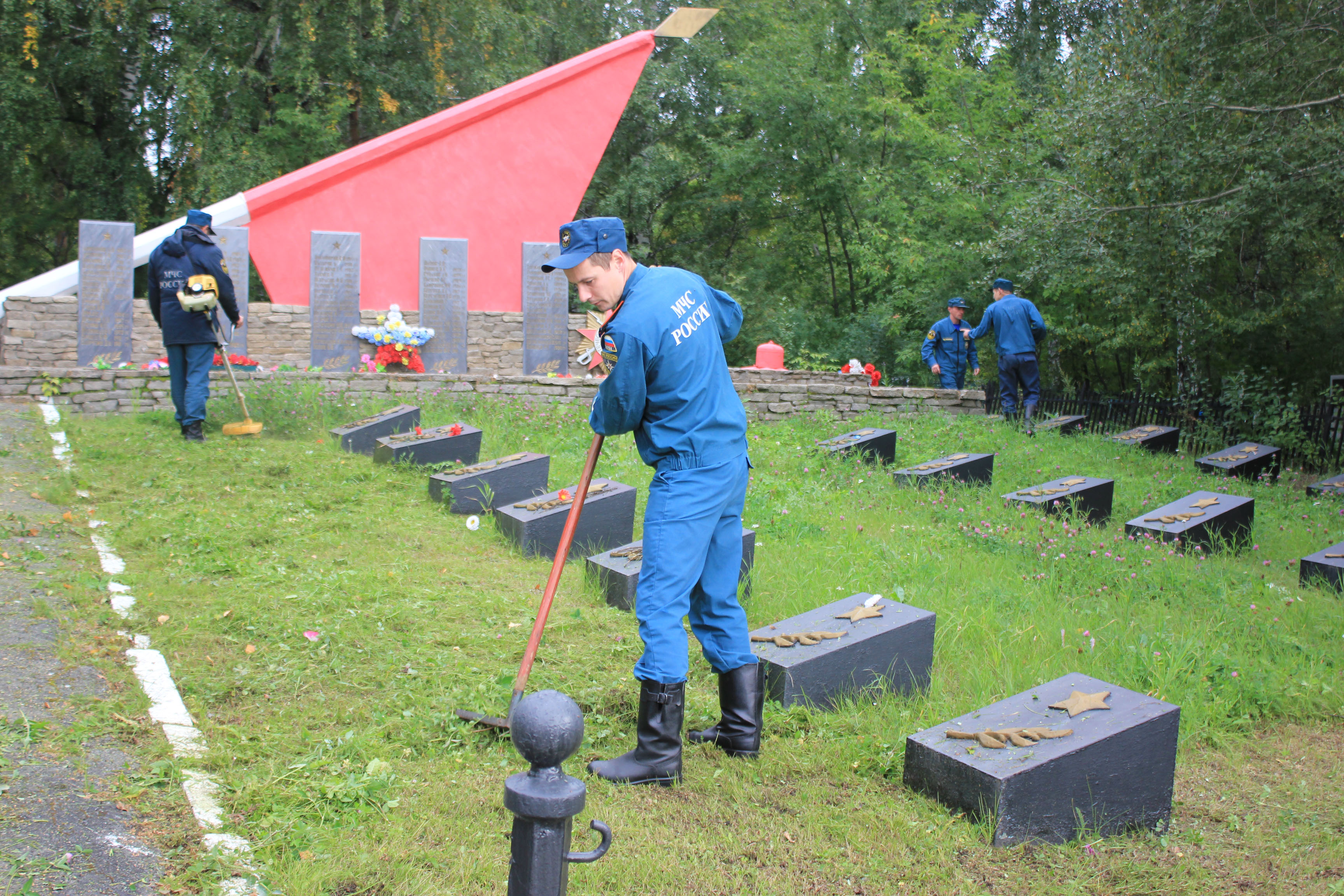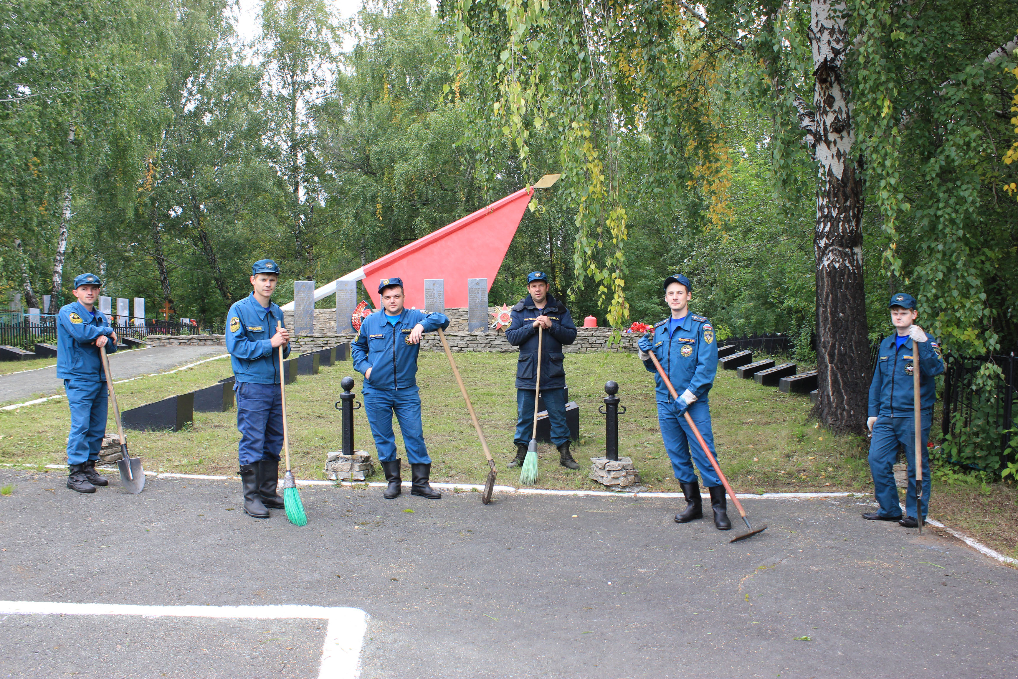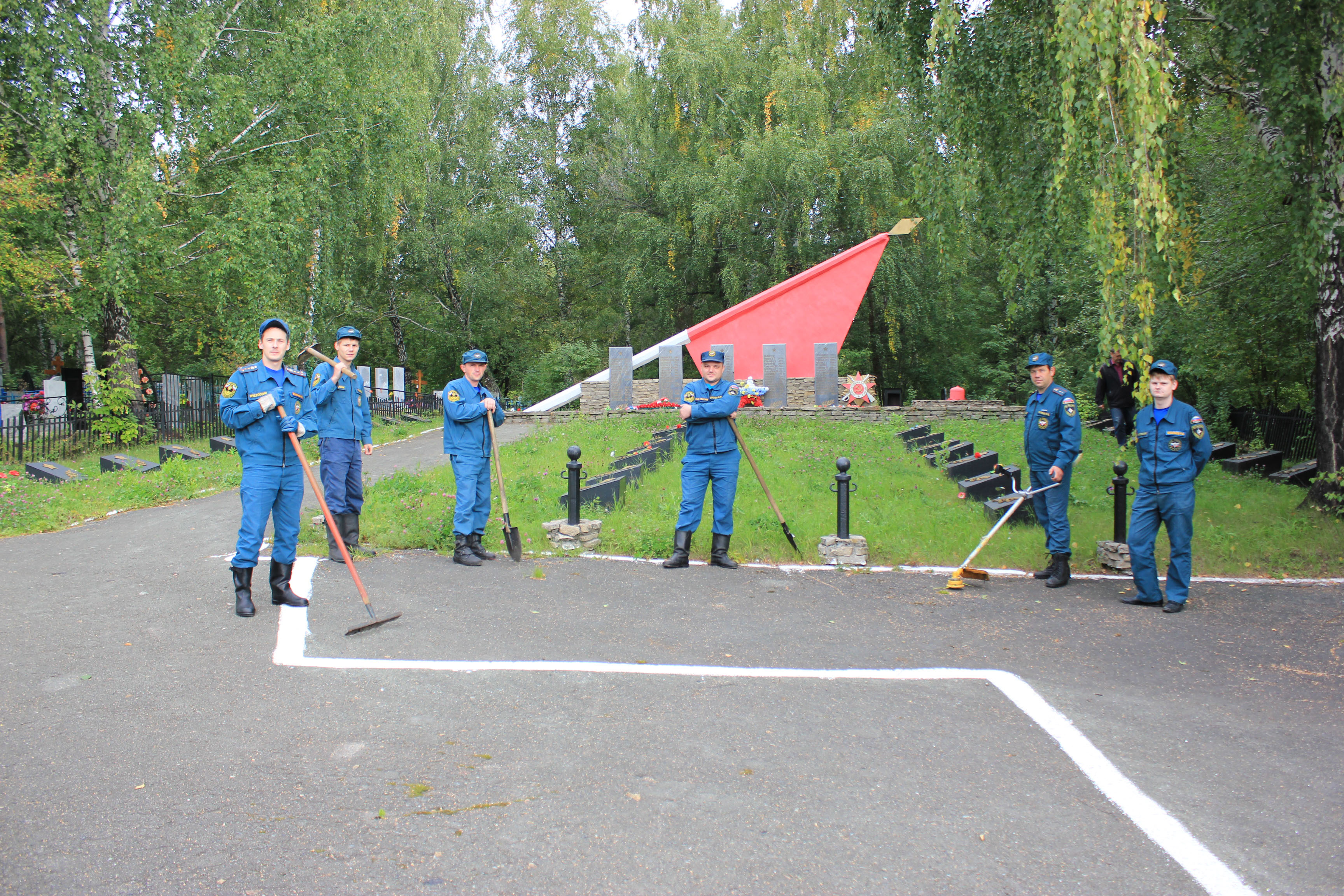 После построения и постановки конкретных задач сотрудники МЧС, вооружившись необходимым инвентарем, рьяно приступили к делу и в течение нескольких часов наводили порядок. Спасатели скосили выросшую за лето траву, убрали мусор, очистили мемориальные плиты и обелиск, а также подмели дорожки. Территория после завершения работ заметно похорошела.