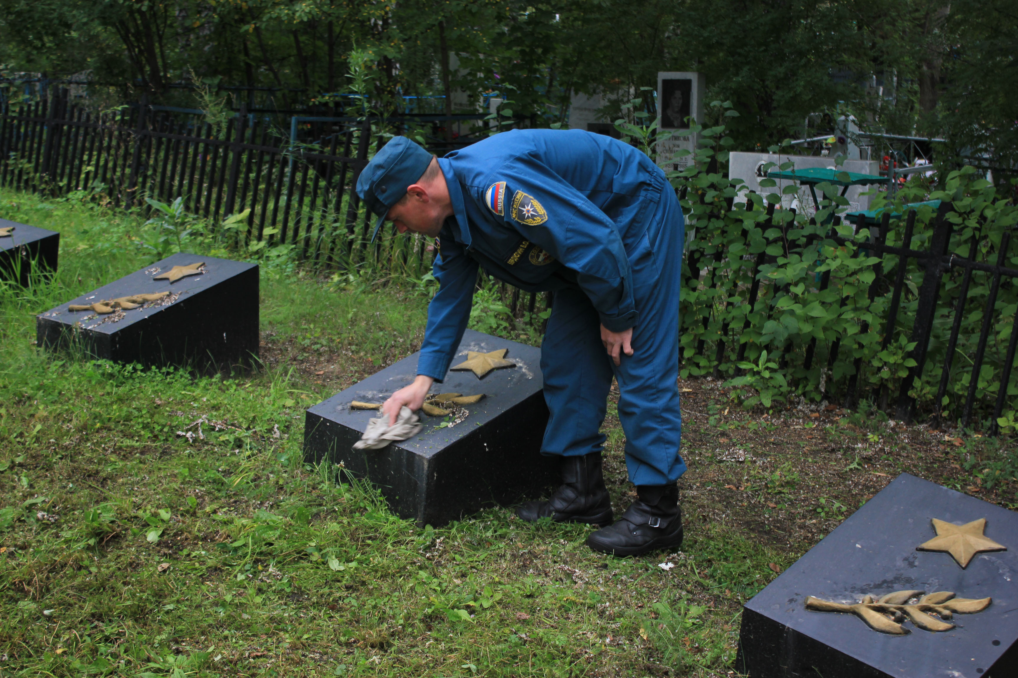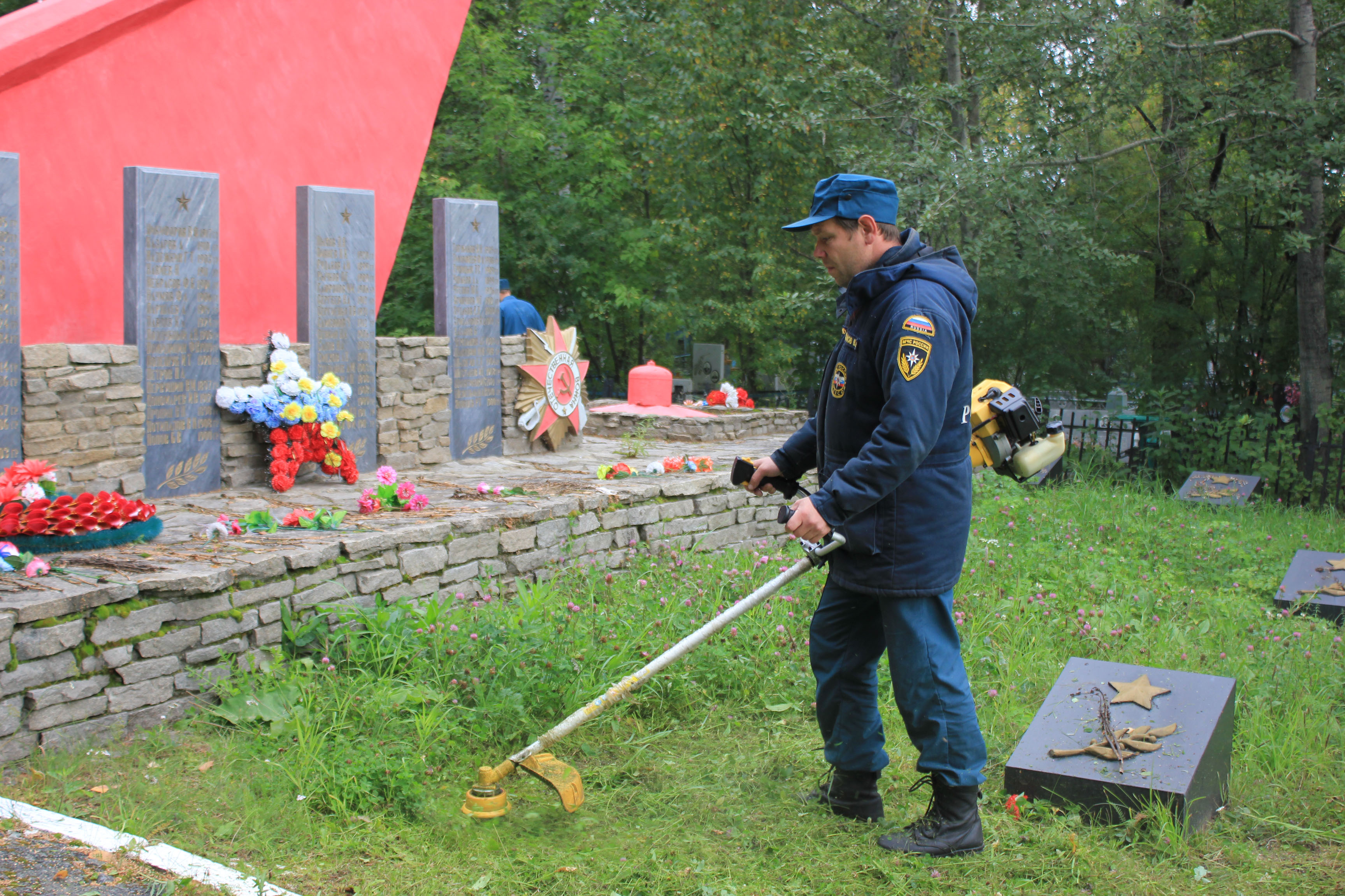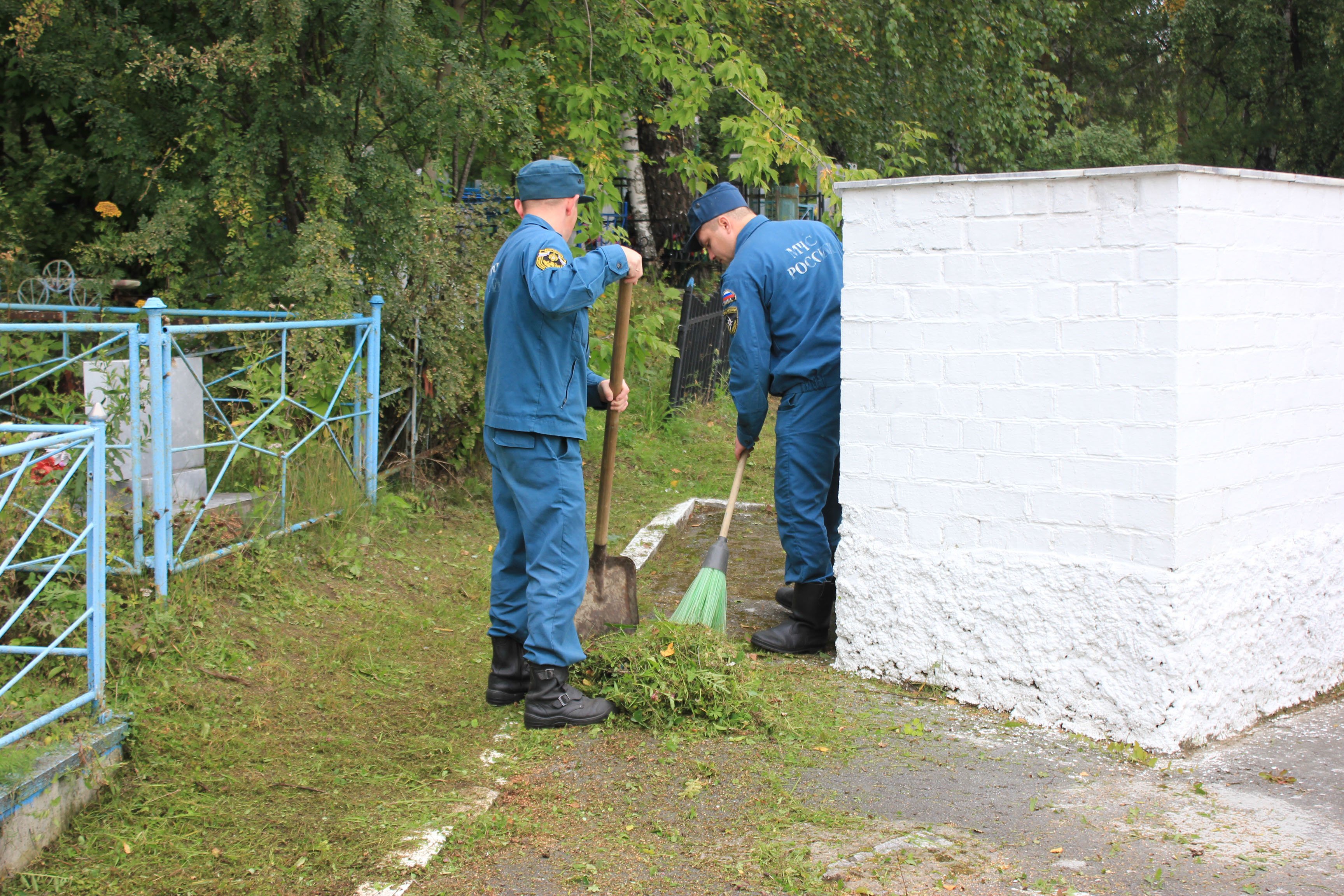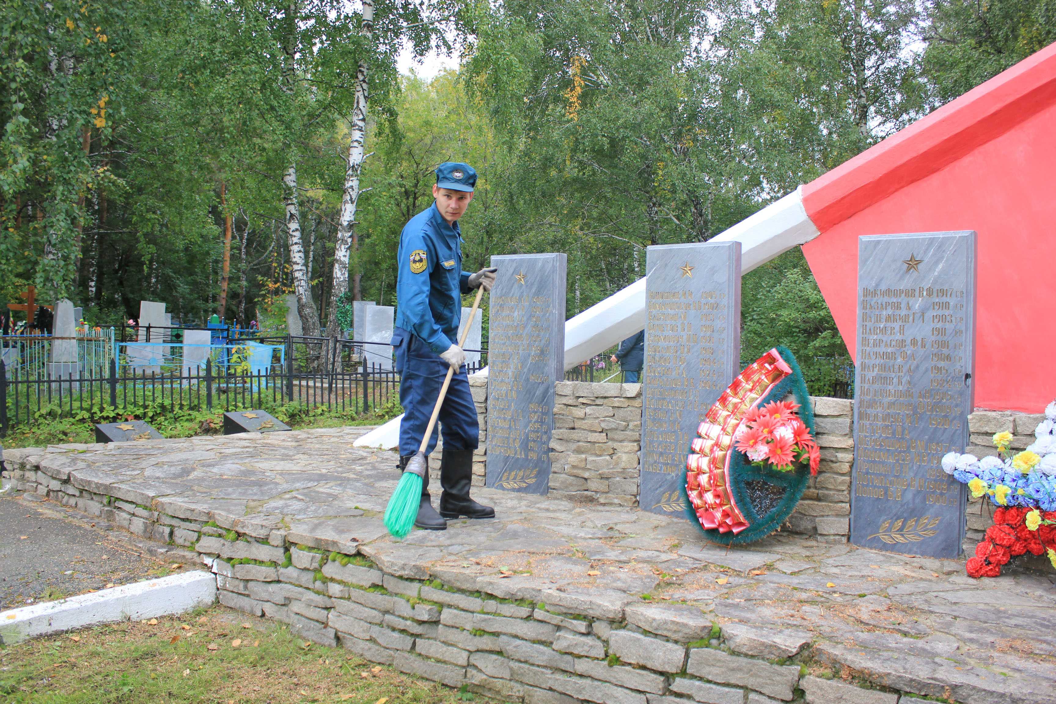 После построения и постановки конкретных задач сотрудники МЧС, вооружившись необходимым инвентарем, рьяно приступили к делу и в течение нескольких часов наводили порядок. Спасатели скосили выросшую за лето траву, убрали мусор, очистили мемориальные плиты и обелиск, а также подмели дорожки. Территория после завершения работ заметно похорошела.