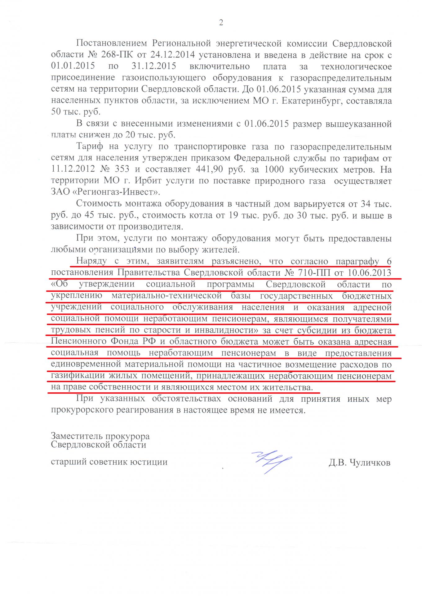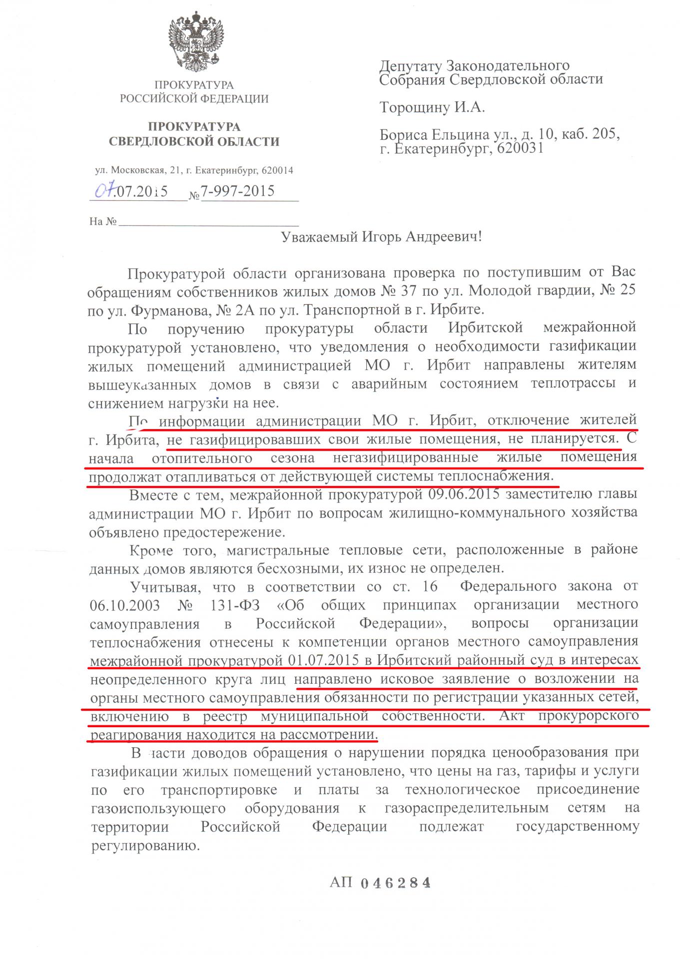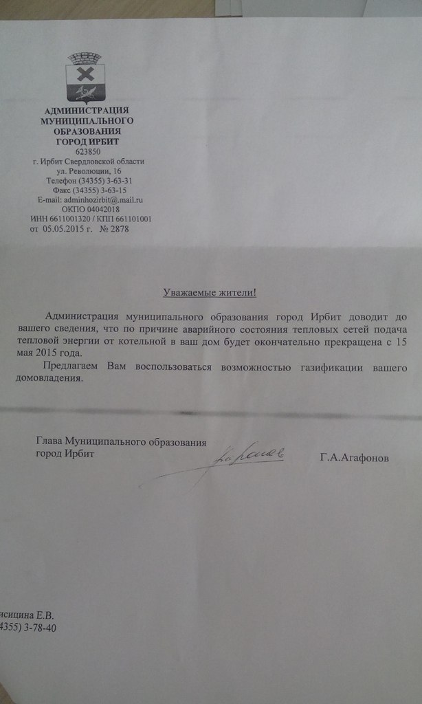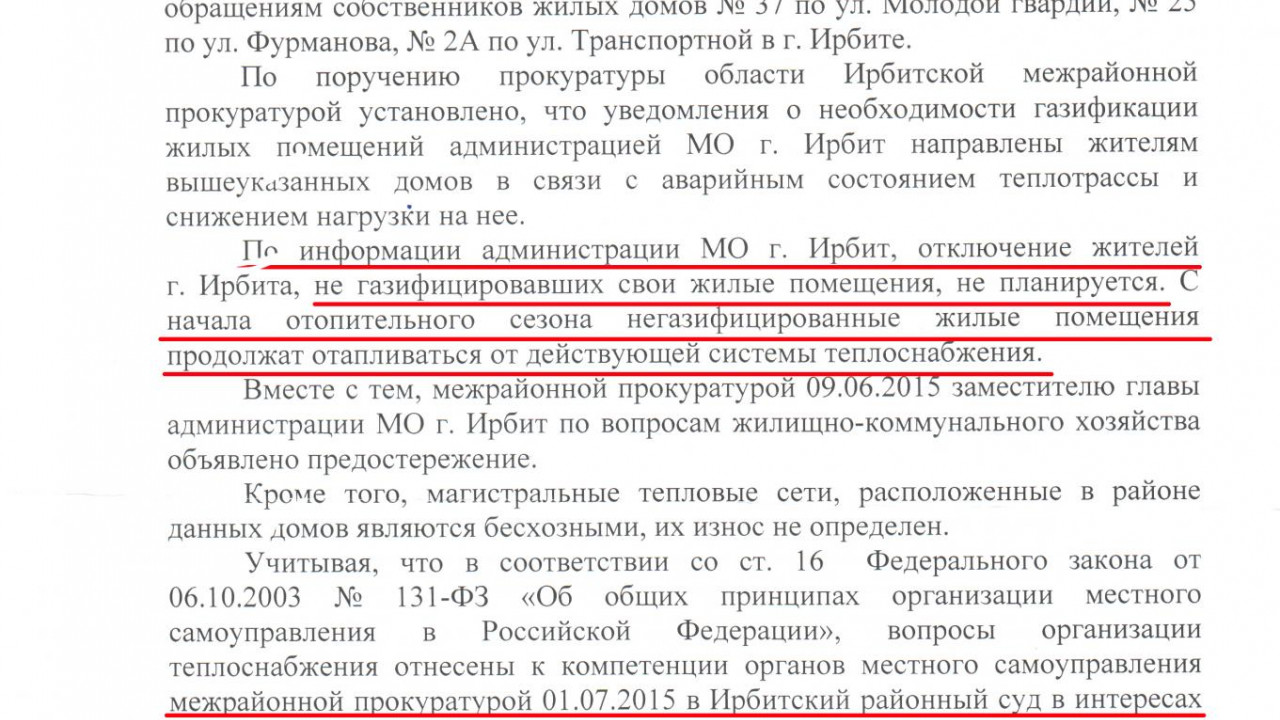 Напомним, к депутату Законодательного собрания Игорю Торощину, обратились жители Ирбита. По словам обратившихся, в мае 2015 года они начали получать уведомления от администрации, в котором жителей уведомили, что по причине аварийного состояния тепловых сетей подача тепловой энергии от котельной в ваш дом будет окончательно прекращена, и предложили воспользоваться возможностью газификации. На момент решения данного вопроса жильцы более 50 домов получили уведомления, часть из которых многоквартирные.