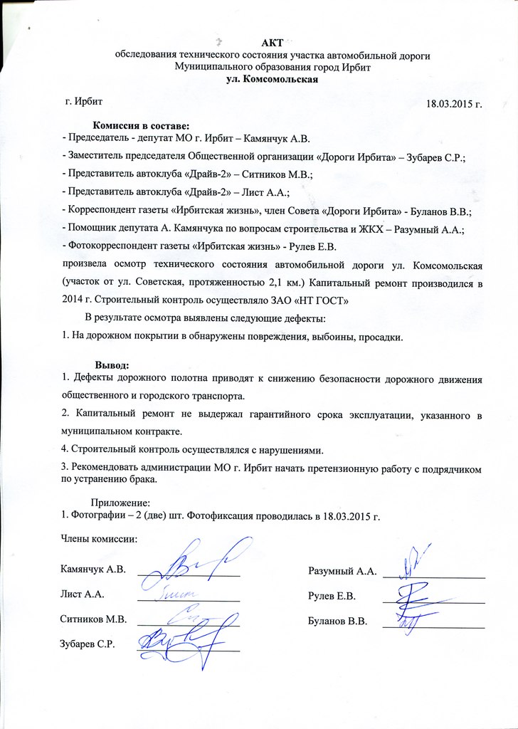 18 марта комиссия в составе депутата А.В. Камянчука, заместителя председателя общественной организации «Дороги Ирбита» С.Р. Зубарева, двух представителей автоклуба «Драйв-2» М.В. Ситникова и А.А. Лист, корреспондента и фотографа газеты «Ирбитская жизнь» произвели осмотр и фотофиксацию повреждений дорожного полотна.