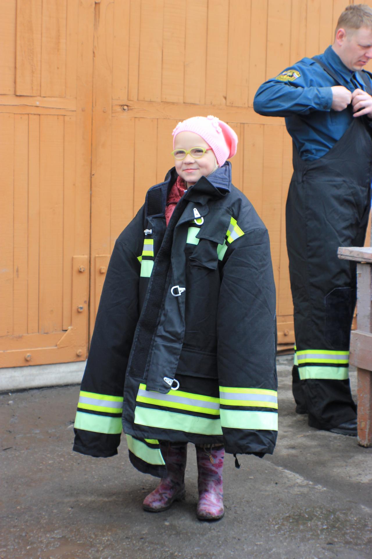 Также вниманию ребят была представлена боевая одежда пожарного. Дети с интересом наблюдали за действиями огнеборца и отсчитывали время, за которое он надевал на себя защитный костюм. Многие смогли примерить «боевку», шлем и сфотографироваться на память.