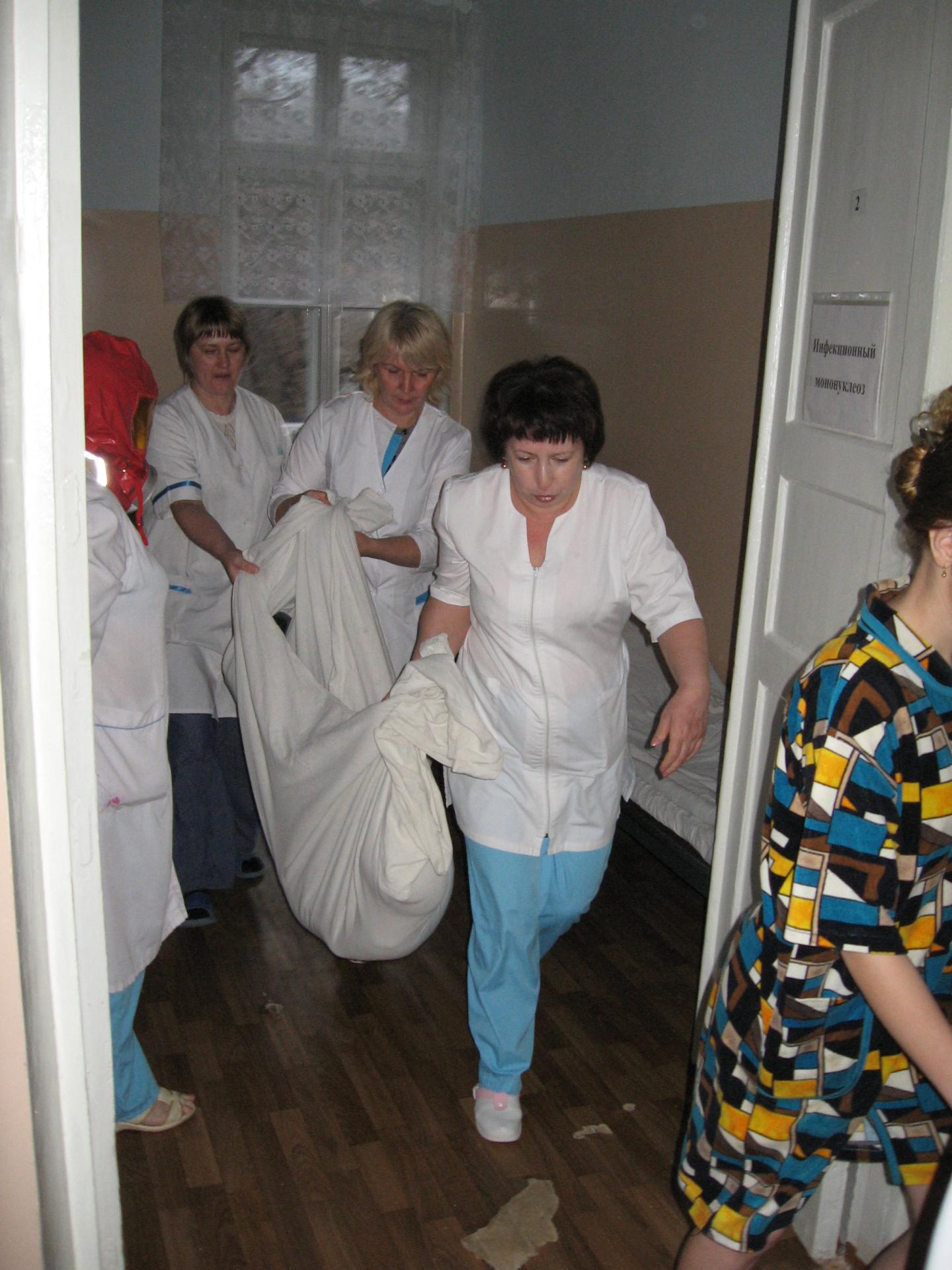 07.11.2013 года в 10 часов 30 минут началась учебная тренировка по эвакуации пациентов и персонала инфекционного отделения ГБУЗ СО «Ирбитская ЦГБ», расположенного по адресу: г. Ирбит, ул. Мальгина, 26. Дежурной медсестре инфекционного отделения ГБУЗ СО «Ирбитская ЦГБ» сотрудниками ОНД МО город Ирбит, Ирбитского МО была дана вводная команда о возгорании в служебном помещении, после чего, работниками учреждения, была включена система оповещения. Дежурная медсестра имитировала вызов пожарной охраны с полным докладом. Началась эвакуация пациентов и персонала. Тренировка проводилась с использованием средств индивидуальной защиты органов дыхания и зрения человека от токсичных продуктов горения. Дежурная медсестра продемонстрировала одевание самоспасателя фильтрующего ГДЗК-У. Также в ходе эвакуации, отрабатывались действия персонала по эвакуации несовершеннолетнего, эвакуировали его при помощи носилок, так как сам ребенок передвигаться не мог. Общая численность пациентов и персонала, принявших участие в проведении тренировки по эвакуации, составило 25 человек. Вся эвакуация заняла полторы минуты, после чего в помещениях отделения не осталось ни пациентов не врачей.