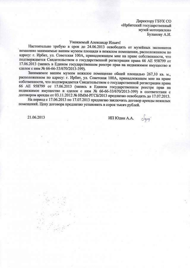 Сегодня в телефонном разговоре с корреспондентом «Нового Региона» Александр Юдин подтвердил, что выкупил у банка помещения Ирбитского музея мотоциклов. По его словам, он действительно предлагает музею съехать и освободить помещения теперь уже его частной собственности. Отвечая на вопрос, понимает ли он, что речь идет о судьбе значимого для города и Свердловской области госучреждения, Юдин говорит: «Да, понимаю». «Я понимаю, что музей – уникальный и все такое. Но кто обо мне позаботится, если не я сам?», – указал собеседник. Предприниматель также подтвердил, что в самое ближайшее время откроет вместо музея мотоциклов мебельный магазин.