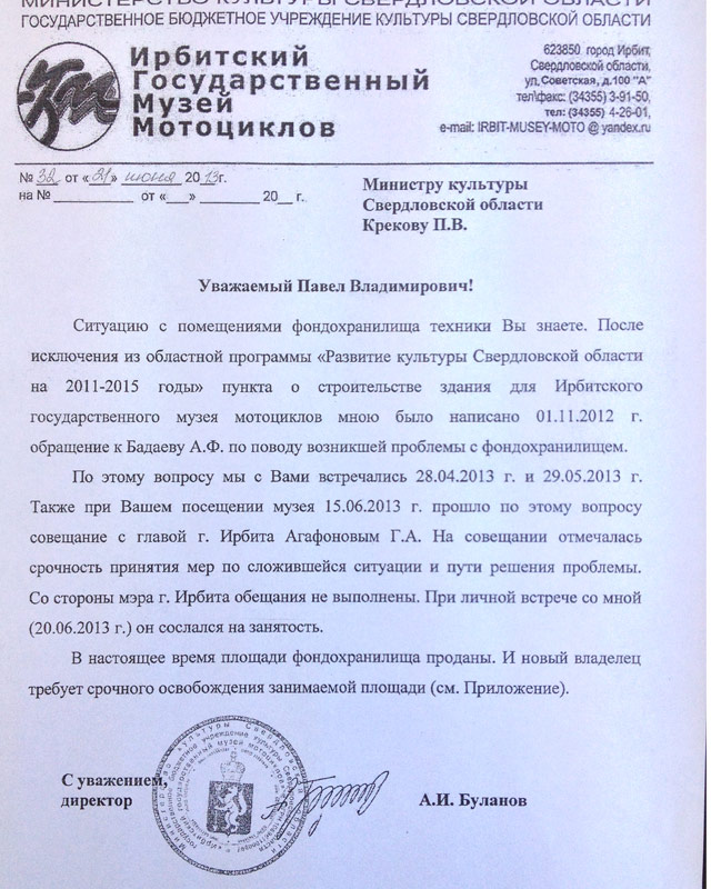 Дальше – больше. Как следует из правительственной переписки (также есть в редакции): проект строительства нового здания для музея мотоциклов внесли в ОЦП «Развитие культуры в Свердловской области» на 2011-2015 годы». Но все что-то не задавалось. Несмотря на то, что проект нового здания для музея был подготовлен Минстроем Свердловской области (это документ на 21 листе, который стоил 4,5 млн., прим. НР) – деньги на саму стройку никто не выделял.