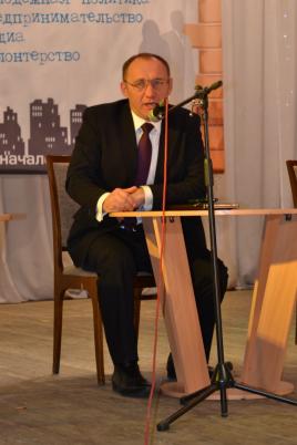 Первый блок форума – диалог с властью. На сцене появляются столы и стулья, в зале – микрофон. Открывает «диалог» К.Г. Говорухин с темой для обсуждения «улучшение жилищных условий для молодых семей». Так как в зале собрались в основном школьники и студенты, возрастной категорией от 15 до 18, то и вопросов, соответственно, особенно много не было, но, несмотря на это, был повод для моей паники. Дело в том, что Геннадий Анатольевич заранее сказал нам, что времени только до 10:45. Микрофон к нему перешёл только лишь в 10:30. И сразу же посыпались вопросы, я, как самая смелая, за ответом иду первая. Мой вопрос посвящается спорту, узнаю о строительстве стадиона за «Кристаллом» (в следующем году на него обещали затратить 6 миллионов рублей), о строительстве бассейна (оказывается, Нижнетагильская проектная компания уже создаёт проект бассейна), предлагаю построить ещё один спортивный центр, старых не хватает. На предложение мэр реагирует положительно, даёт нам яркие прогнозы на будущее. Что ж, здорово. Идём дальше.