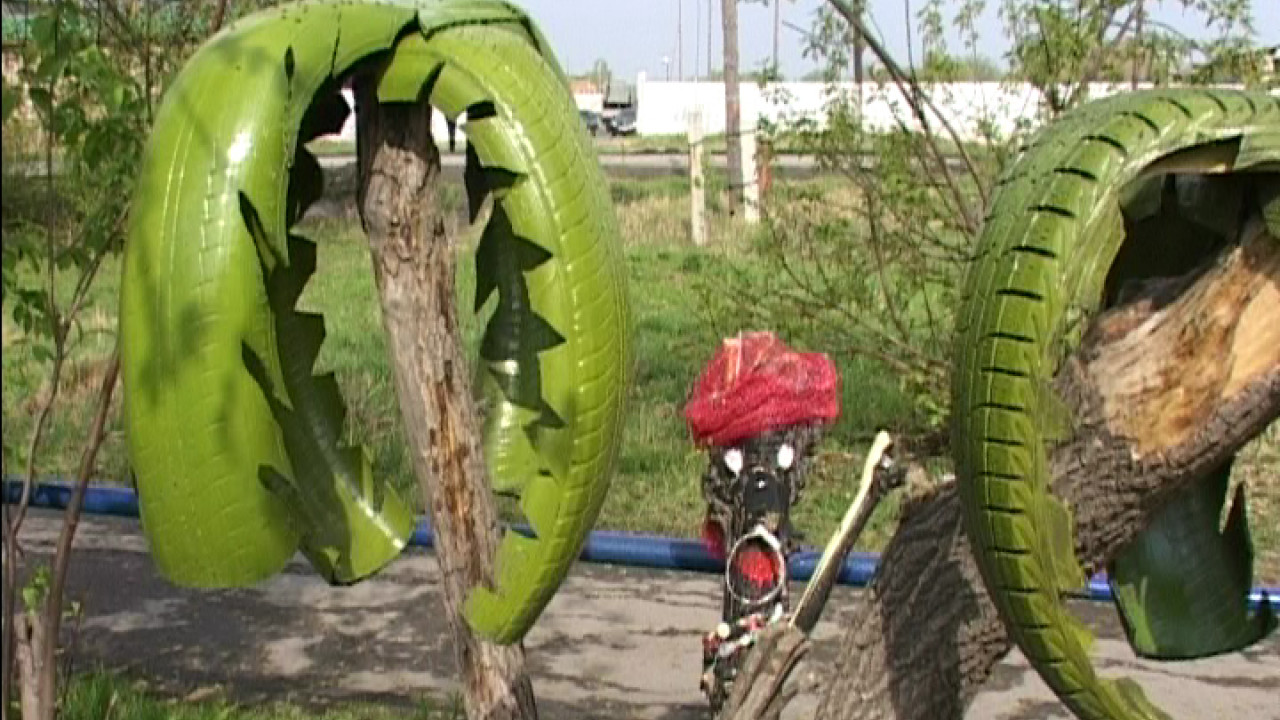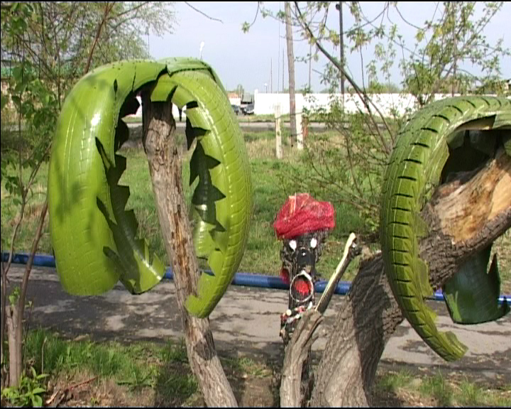 Раньше это был самый заурядный двор со стоянкой для машин. Теперь машинам в этом уголке не место. Отгорожено колесами. Только тополь раньше здесь рос необычный, врос корой в металлическое ограждение. Теперь его спилили, а пень стал декоративным дополнением на площадке. У коменданта Сергея Серкова еще много планов. Хочет соорудить еще одни качели, другой конструкции, но пока нет необходимых материалов.