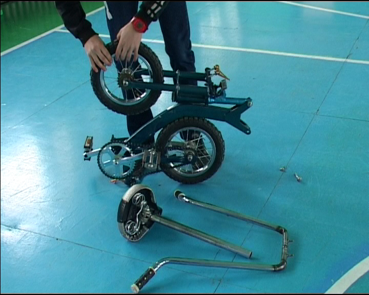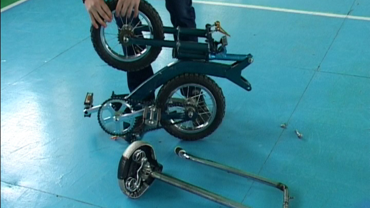 На этом транспортном средстве можно развить скорость 40 километров в час. Кроме отличных ходовых качеств у велосипеда Евгения Шабалина есть и другое преимущество. Велосипед превращается в малогабаритный багаж за 1 минуту 12 секунд. Достаточно вынуть из рамы два шарнира. И аккуратно свернуть агрегат. Евгений провёл патентный поиск и обнаружил, что похожих конструкций не запатентовано. Работу планировалось показать на всероссийской олимпиаде по технологии. В Москву на международный салон изобретений и инновационных технологий «Архимед 2012» велосипед попал попутно.