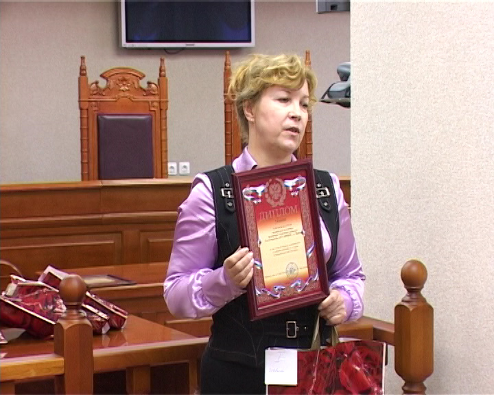 Совет судей по итогам конкурса, рассмотрев обращение руководителя отдела по связям средств массовой информации, принял участие и наградил дипломами. Дипломом первой степени награждается творческий коллектив «Судебный вестник» телекомпании НТС-Ирбит. С высокой трибуны прозвучали имена тех, кто участвует в этом проекте. Это оператор Евгений Присяжнюк, видеоинженер Владимир Криваль и Дмитрий Тетюцкий. Были отмечены и работники Ирбитского районного суда, прежде всего председатель суда Бунькова Н.А. и помощник председателя Медведенко А.Н., им вынесена благодарность за совместную плодотворную работу. Дипломы были вручены помощнику судьи Ирбитского районного суда Лобановой Елене Викторовне и помощнику председателя Ирбитского районного суда Медведенко А.Н.