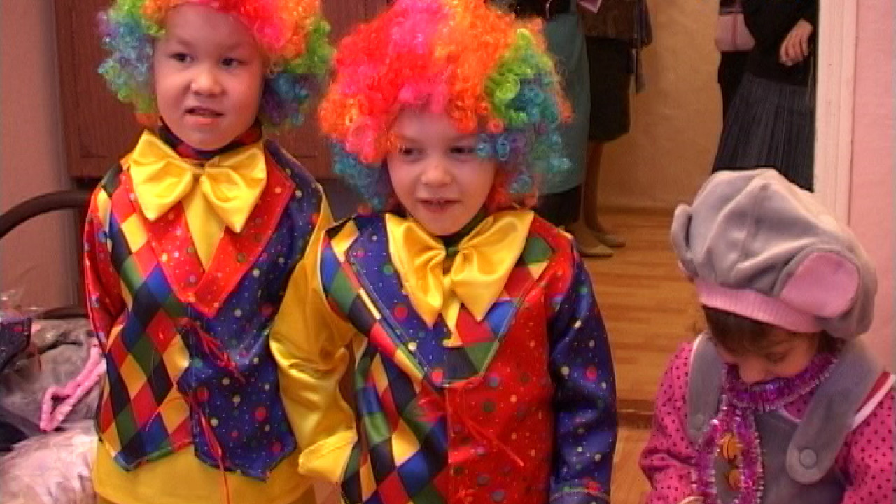 Гостья Наталья Ильиных с подарками – новогодними костюмами пришла в детский дом утром. Все ребята были в школе. Только малышка Анюта и еще несколько мальчиков были дома. Они сразу же начали примерять обновки на себя. Милая мышка-малышка получилась из Анюты. А мальчики превратились в клоунов.