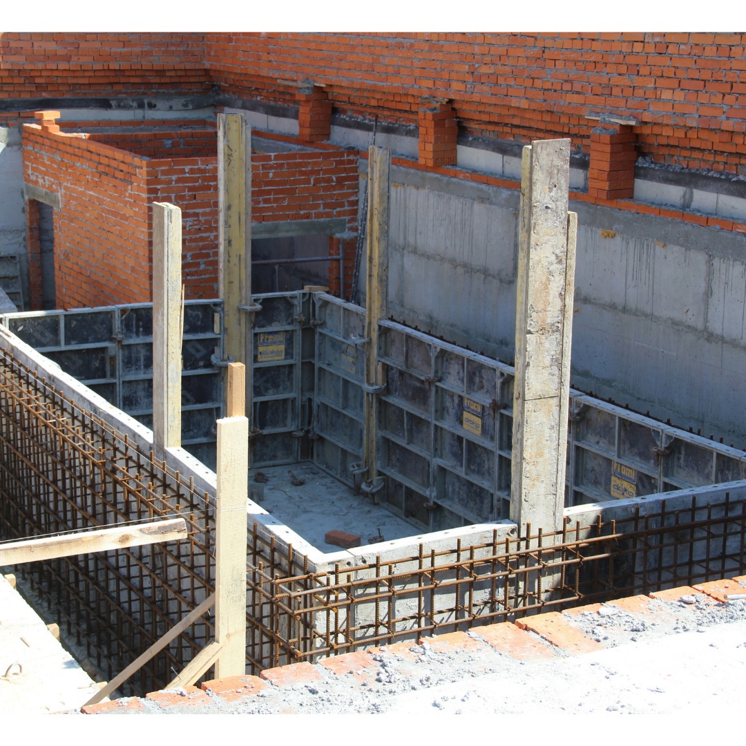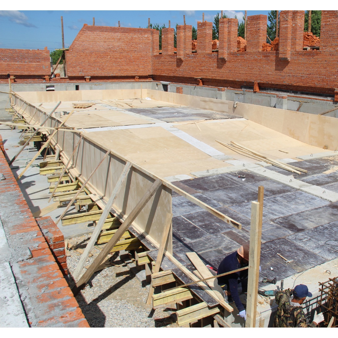 Рабочие занимаются возведением каркаса спортивного зала и опалубки для стен основного бассейна, а также установкой лестничных маршей.