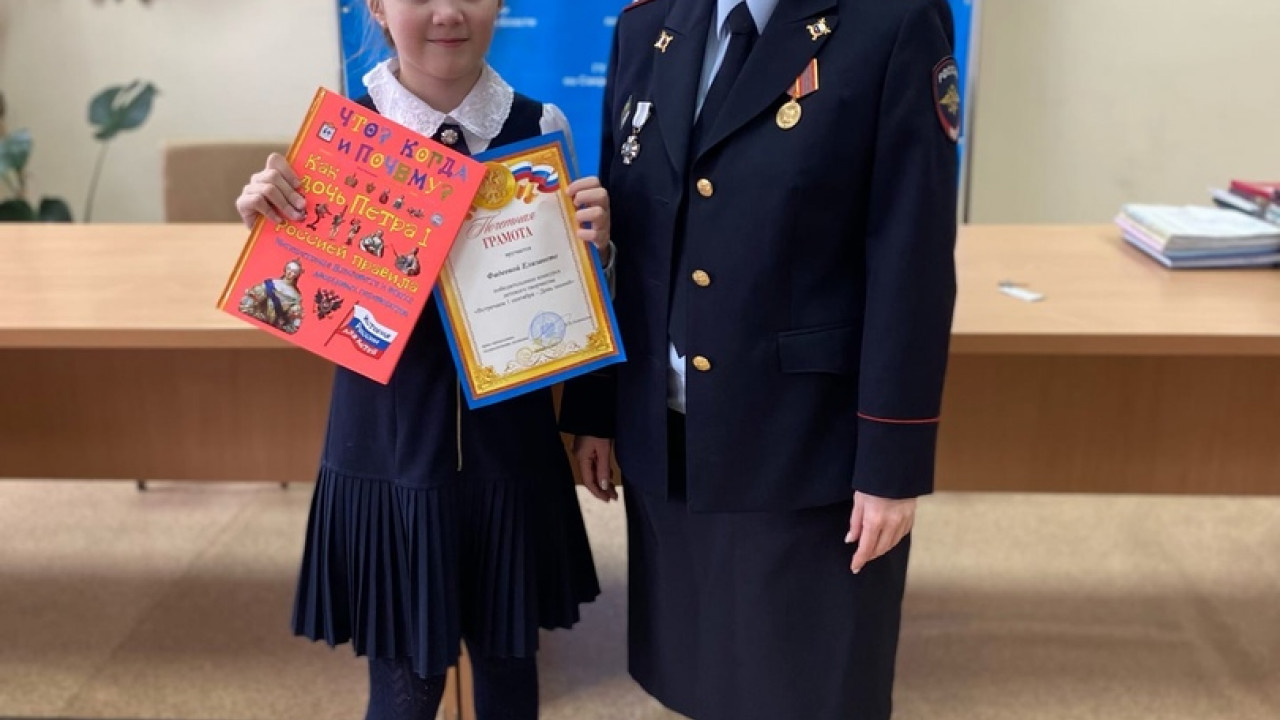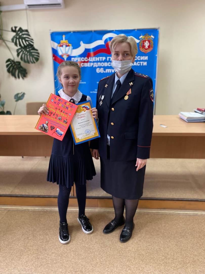 Накануне в отделе полиции города Ирбита подвели итоги конкурса. Победителем стала Елизавета Фадеева, ученица 3 «А» класса школы №13. Юрисконсульт правовой группы МО МВД России «Ирбитский» капитан внутренней службы Екатерина Анисимова поздравила Елизавету с победой в конкурсе и вручила на память диплом и в подарок энциклопедию, пожелав новых побед и активного участия во всех конкурсах, проводимых в том числе органами внутренних дел.