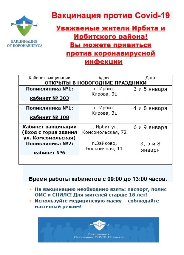 прием взрослого населения Ирбитского района терапевтом (г. Ирбит, ул. Кирова, 31) с 9:00 до 14:00 ч. – 03, 05 и 08 января 2022 года, проведение ВК с 9:00 до 13:00 ч. – 03, 05 и 08 января 2022 года;