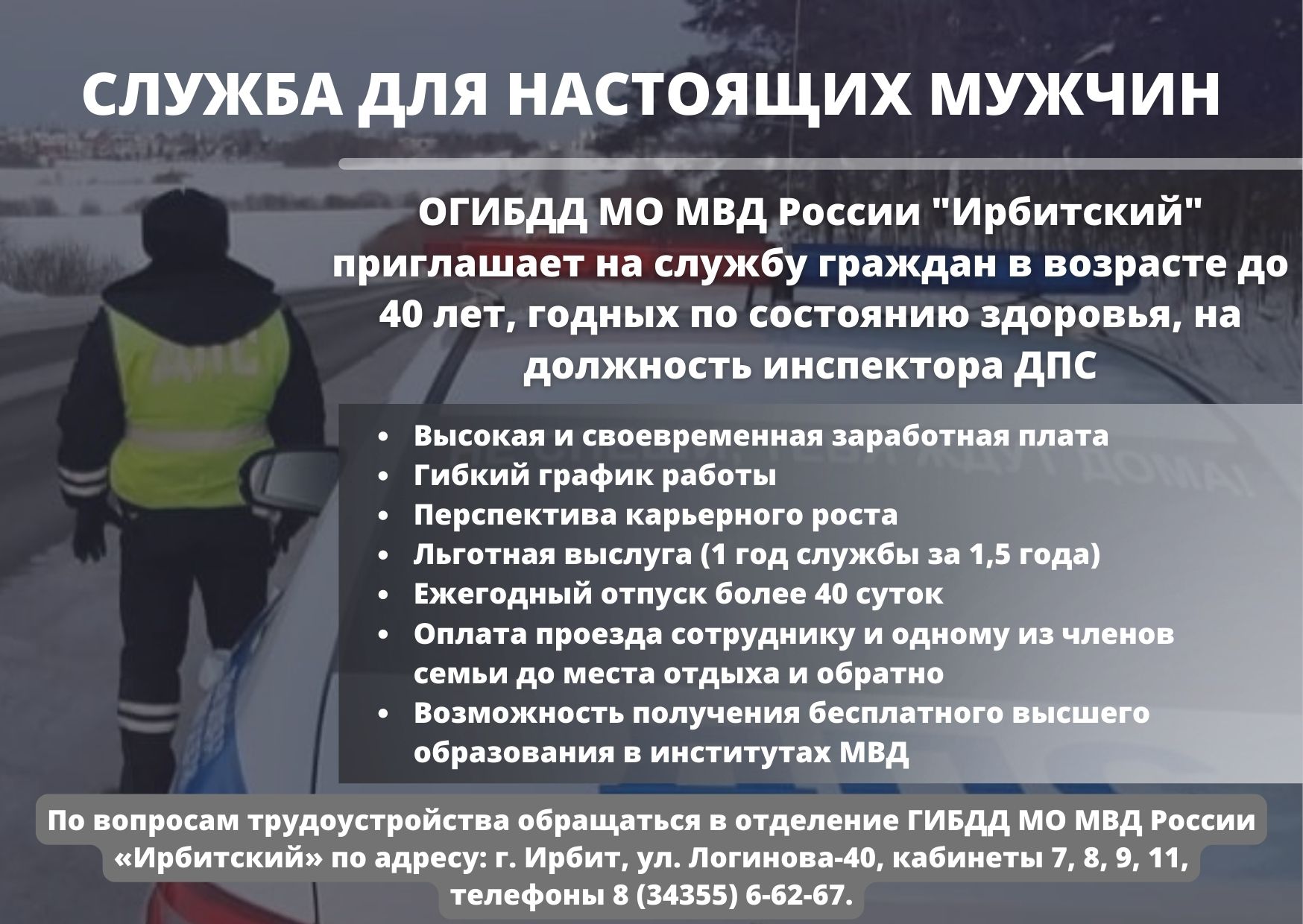 Объявляется дополнительный набор кандидатов на прохождение службы в органы внутренних дел Российской Федерации на должность инспектора дорожно-патрульной службы отдельного взвода ДПС (инспектор ДПС) ГИБДД межмуниципального отдела МВД России «Ирбитский».